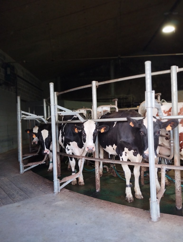 Dan nam ik ’s avonds nog een foto van onze carrousel. Daar melken we nog altijd graag – dit jaar al 10 jaar! Net als de leeftijd van ons Tisha ook dus. Hier zien jullie de koeien Havana, Mathilde en Treesje. Ze worden op de carrousel herkend door hun pootband, waardoor de liters melk bij de juiste koe worden geregistreerd. Zo vinden we alles terug op de computer, waar we ook werken met het programma Ceres (van Agrovision).
