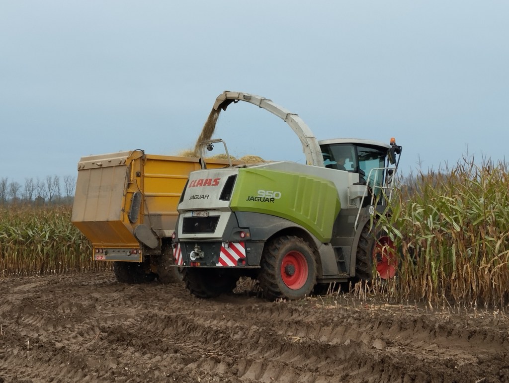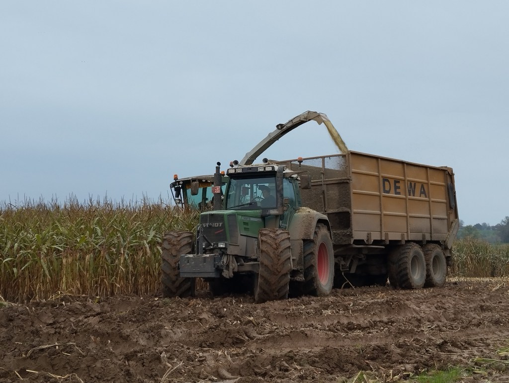 Na een eerste keer maïs hakselen op 24 oktober 2024, was het op 13 en 14 november 2024 zover voor het tweede deel. Nu moest een lege kuil weer helemaal opgevuld worden met maïs. De laatste maïs van 2023 die nog in die kuil zat, hebben we op 12 november nog verhuisd: opscheppen en afkippen bij de nieuwe kuil van 24 oktober, zodat we die eerst nog helemaal kunnen opvoederen.