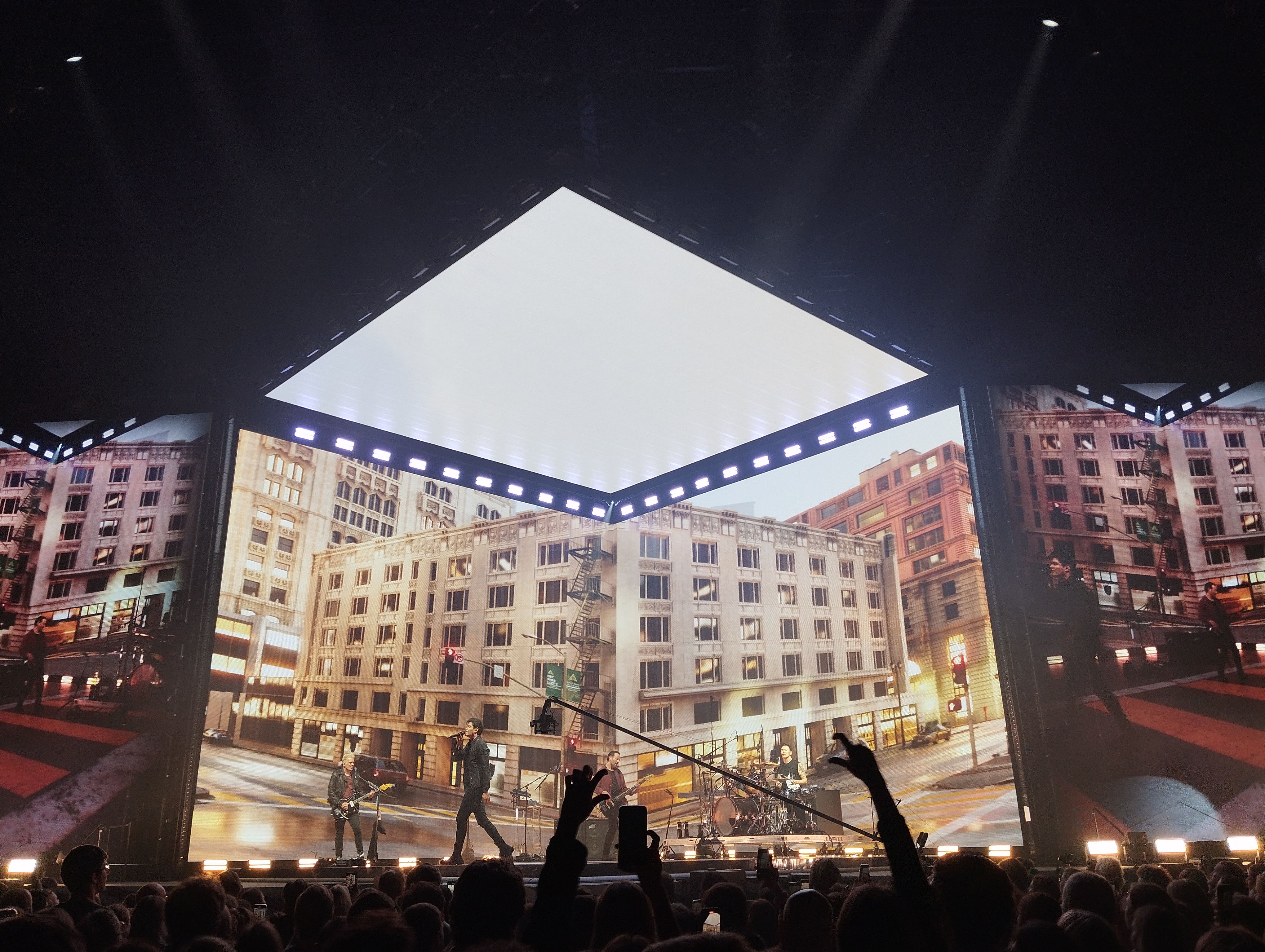 Er was een klein podium tussen het publiek op het middenplein, met daarboven precies satellieten, waar ze in het begin 3 nummers zongen, en later nog eens terugkwamen voor 2 songs. Vooraan had je dan het grote podium, met indrukwekkende schermen. Wij stonden er net middenin tussen, waardoor we echt alles goed zagen. Het was genieten!