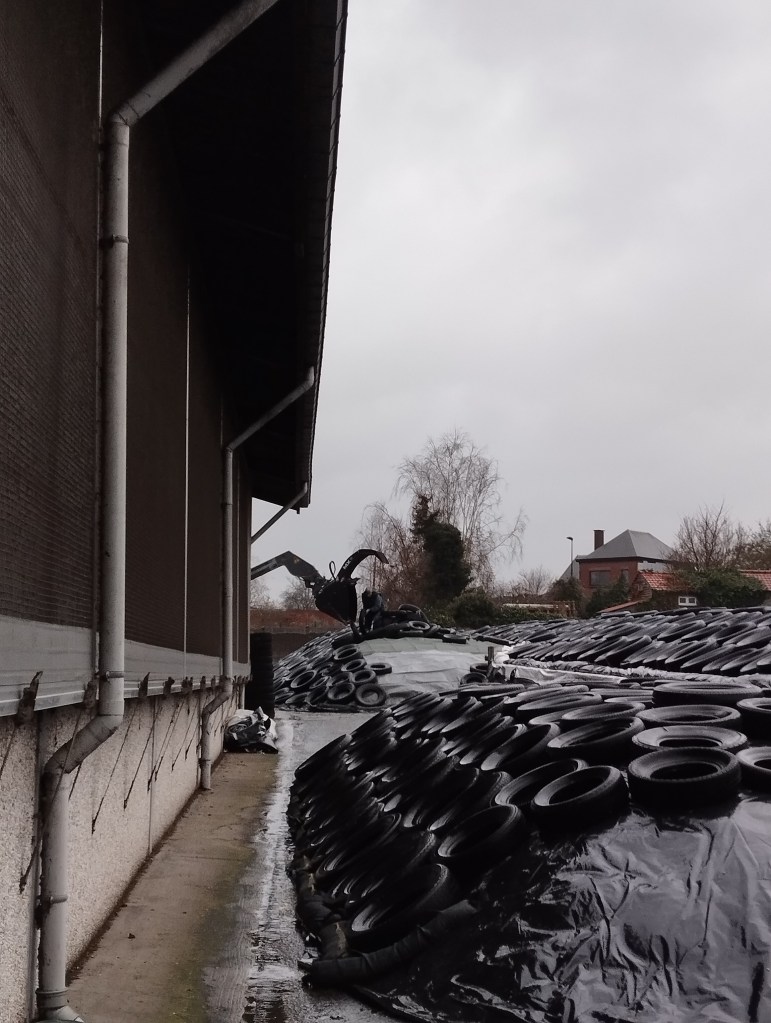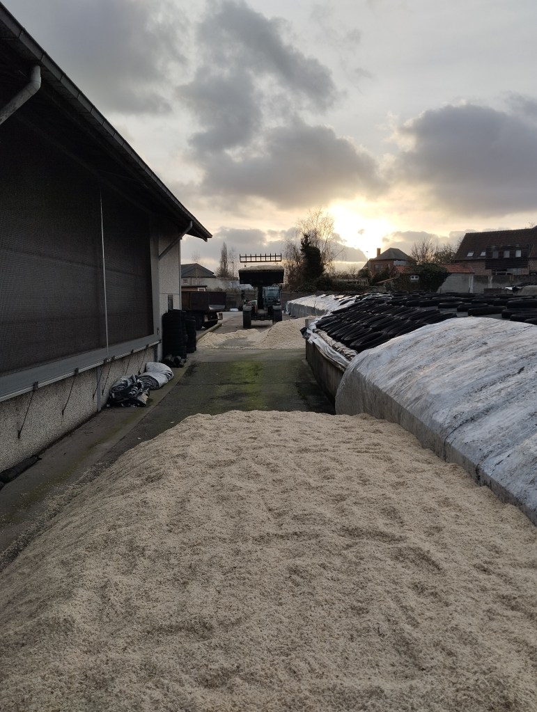 Op woensdag 4 december werd 1 camion geleverd, op zaterdag 7 december werden er 6 camions perspulp geleverd! Boer Herman heeft dan heel wat werk met de verreiker want er moesten 4 camions verschept worden om op de juiste plaats te komen. Een beetje aanrijden met de tractor kan maar meestal doen we het gewoon door er zelf wat door te trappelen en met een hark nog wat effen te trekken. Ik postte in 2019 en 2020 al eens een bericht hierover: Perspulp ingekuild en Perspulp ingekuild, jongvee op stal.