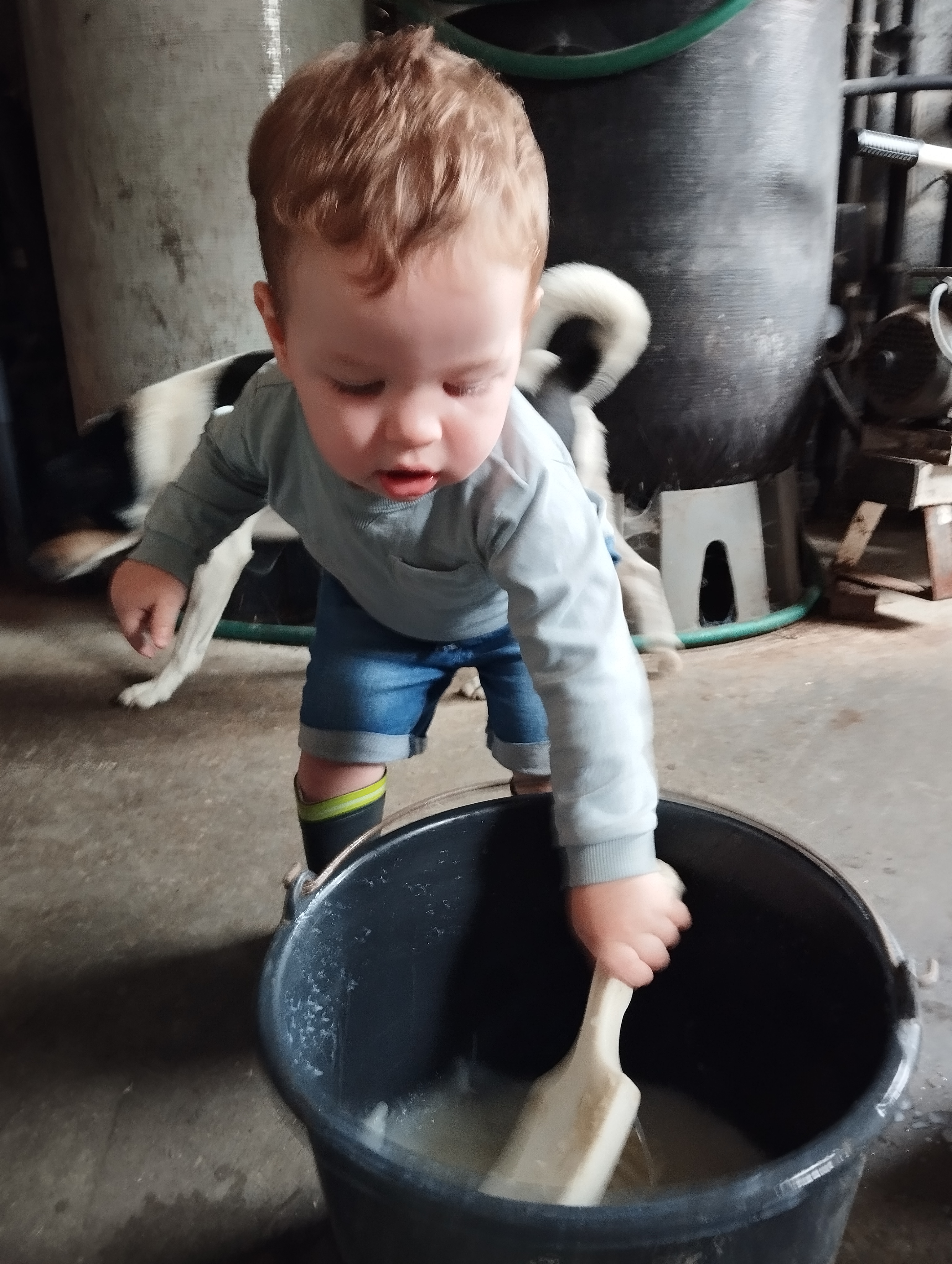 Vooral op de tractor zitten doet hij graag. Zelf achter het stuur zitten en doen alsof. Af en toe rijdt hij eens mee met mij terwijl ik aan het voederen ben of voeder aan het bijschuiven ben. Wij deden dat vroeger ook als we klein waren, en m’n nichtjes reden een paar jaar terug ook regelmatig mee met mij. Victor kan nog niet zo veel woordjes zeggen, maar tractor is er wel één van. Zalig, toch! Hier krijg je nu gewoon zalige foto’s, zonder uitleg, want de foto’s zeggen genoeg.