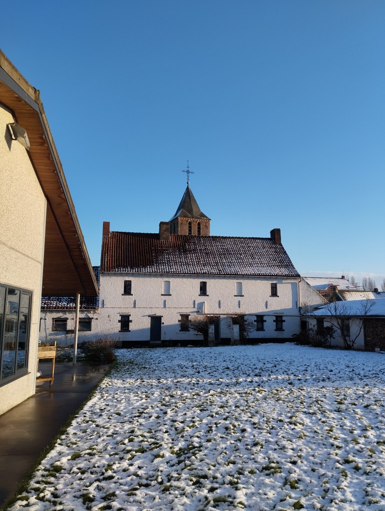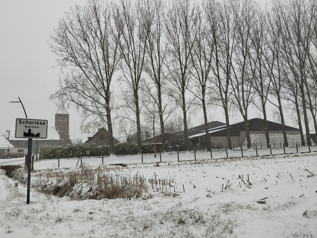 Het heeft gesneeuwd! Het blijft toch altijd iets speciaals, want het gebeurt niet zo heel veel. Al is het nu wel het derde jaar op rij dat het sneeuwt in januari. Als ik dan eens op m’n blog zocht naar eerdere berichten over sneeuw, werd het me duidelijk dat er regelmatig eens sneeuwvlokken naar beneden dwarrelen in januari. Ik zet de jaren verder in dit bericht eens op een rij. Ook geef ik jullie de mooiste foto’s. Vooral als de hemel na een sneeuwbui weer opklaart, zorgen de blauwe lucht en de witte taferelen voor mooie plaatjes. Op deze eerste foto zorgen de grote, witte wolken rond de kerk van Schorisse voor een indrukwekkend effect. Op het dak van de stal zie je dat de sneeuw vrij snel wegsmolt, omdat de koeien veel warmte uitstralen. Het carrouselgebouw (rechts) is geïsoleerd, wat ervoor zorgt dat het dak langer wit blijft.