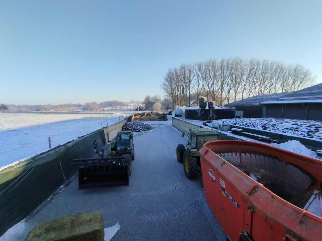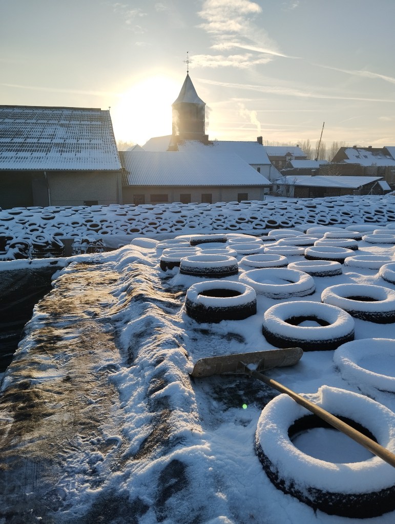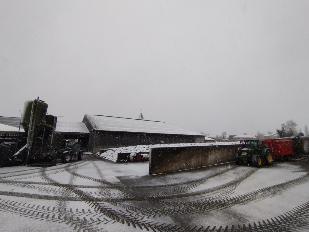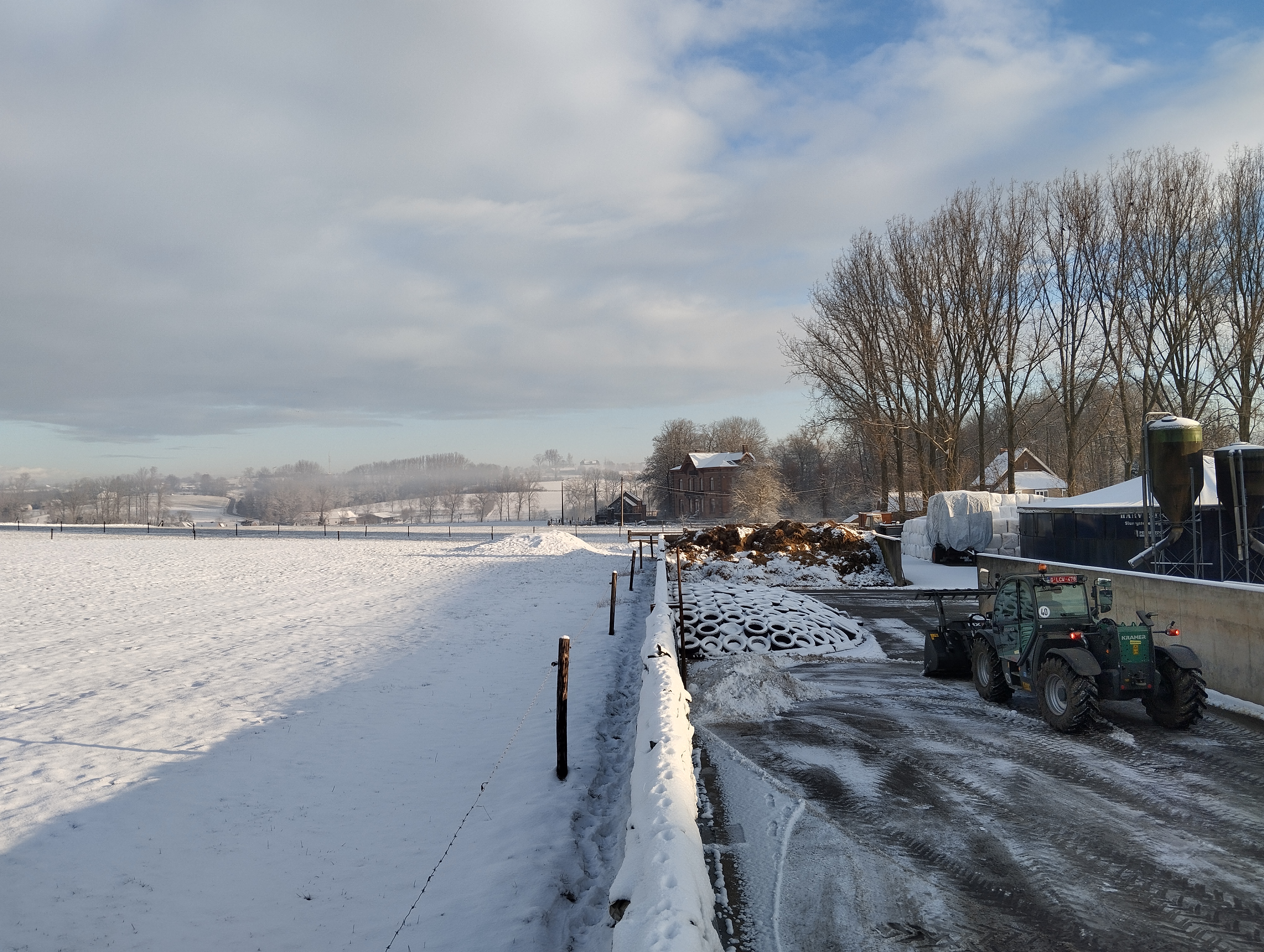 Dit jaar was het dus tijd voor sneeuw op 9 januari! Ik was aan het voederen toen het nog een hevig sneeuwbuitje deed. Het is eens iets anders om zo te voederen! Maar we mogen niet klagen, want dit beetje sneeuw is niets in vergelijking met de sneeuwstormen in Amerika. In de namiddag kwam de zon piepen en dan maakte ik de kuil sneeuwvrij zodat ik de dag nadien vlot zou kunnen beginnen. Want eerst sneeuw en dan de nacht nadien vriezen, dan ligt alles vast gevroren. Ook de komende dagen zal ik op het warmste van de dag moeten zien dat m’n kuil klaar is. Een boer moet altijd rekening houden met het weer!