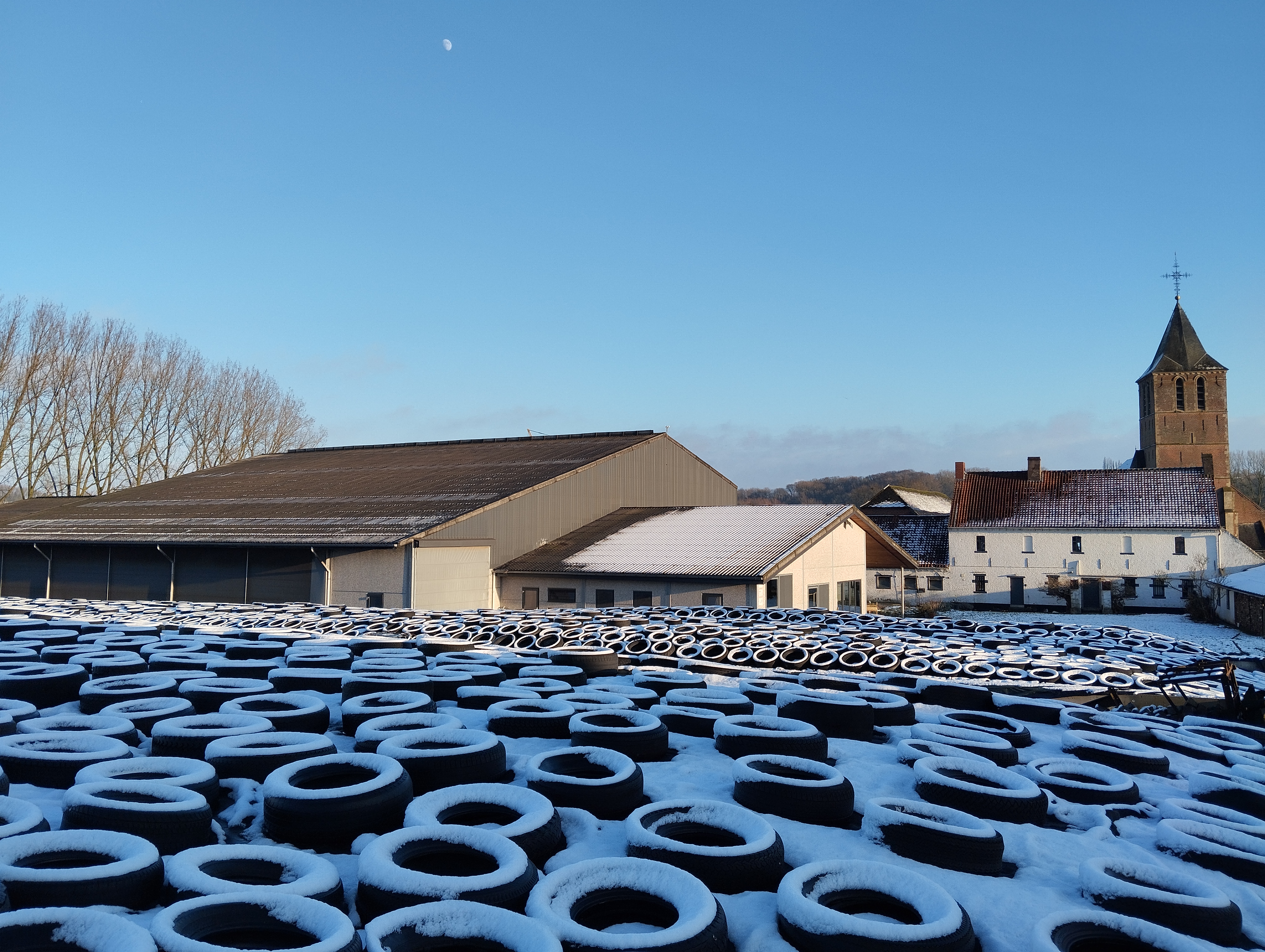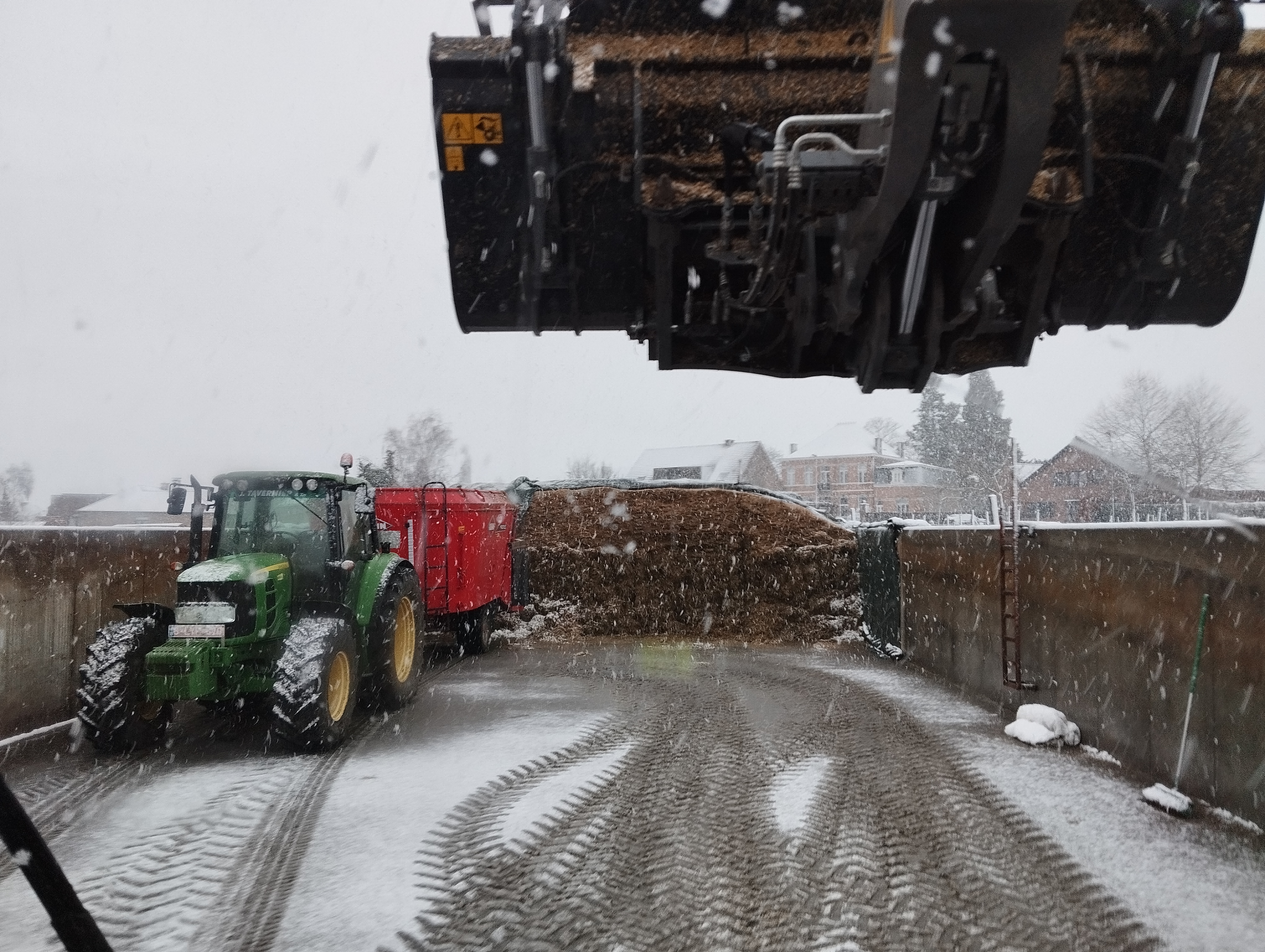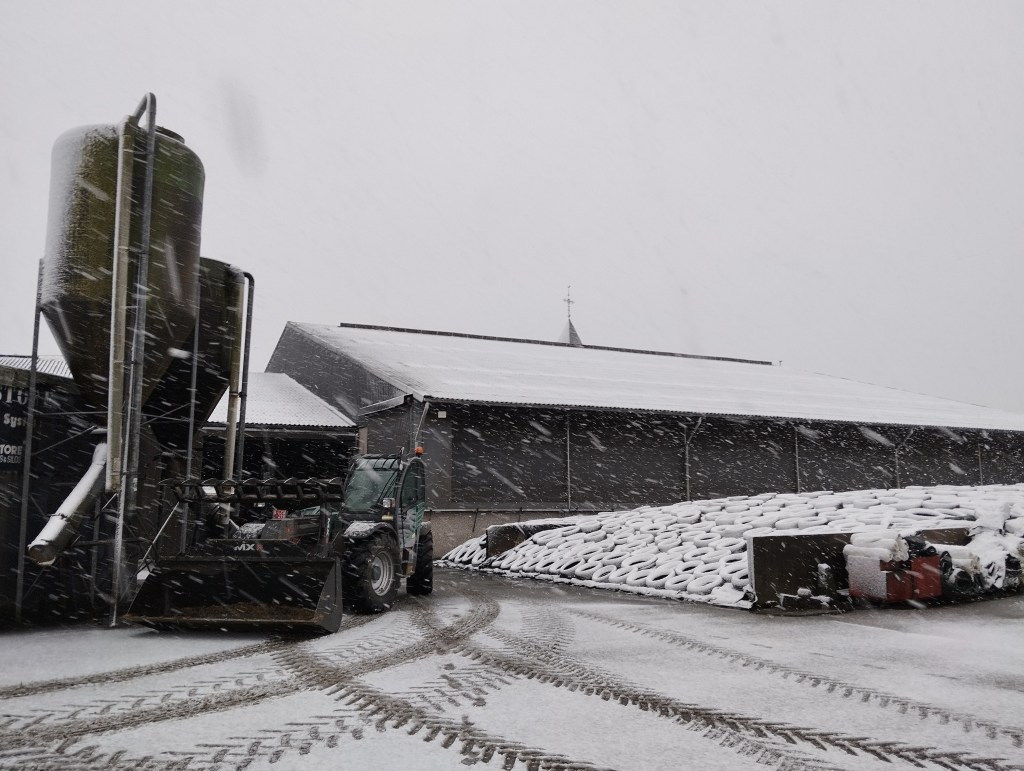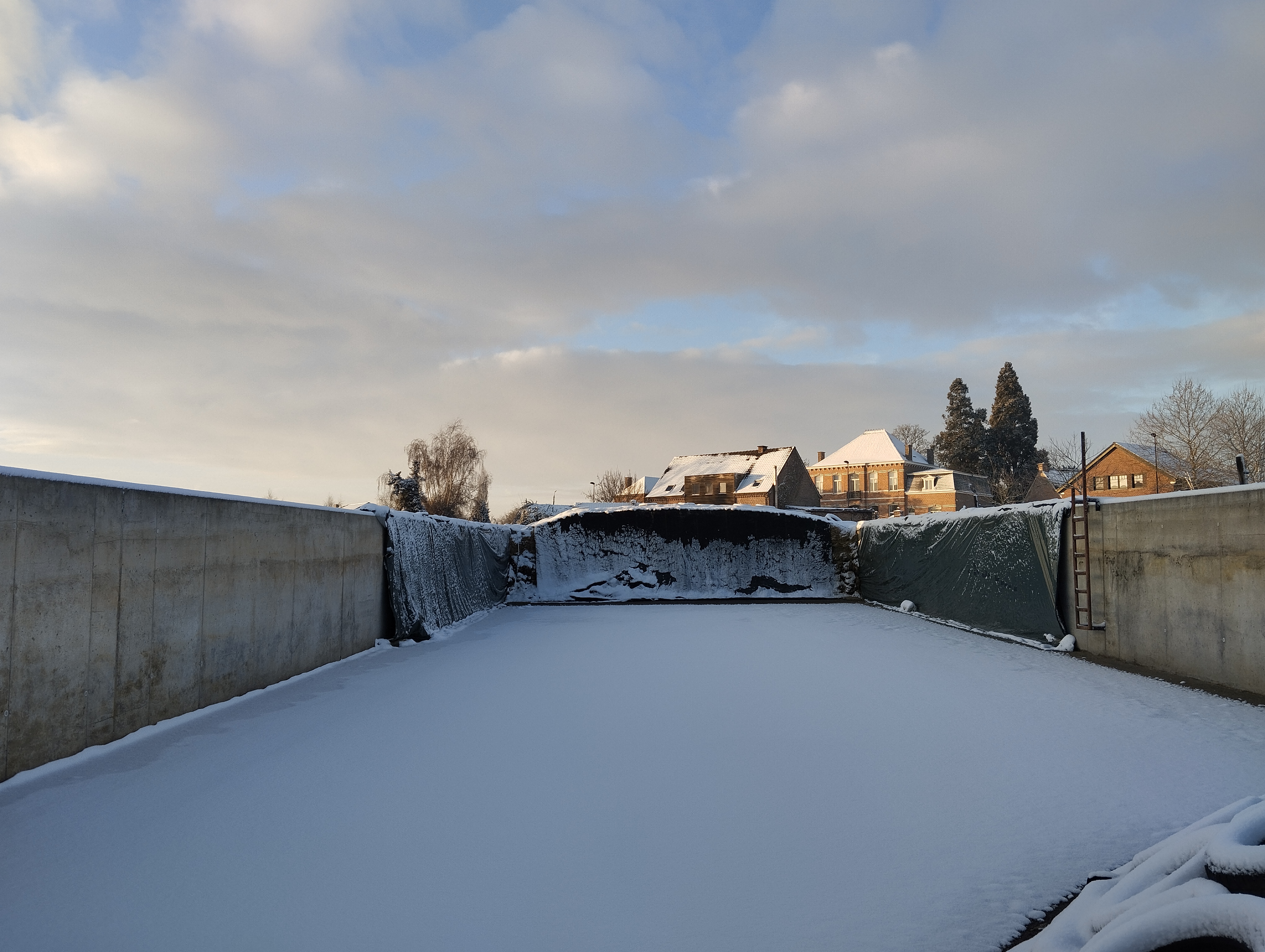 Dit jaar was het dus tijd voor sneeuw op 9 januari! Ik was aan het voederen toen het nog een hevig sneeuwbuitje deed. Het is eens iets anders om zo te voederen! Maar we mogen niet klagen, want dit beetje sneeuw is niets in vergelijking met de sneeuwstormen in Amerika. In de namiddag kwam de zon piepen en dan maakte ik de kuil sneeuwvrij zodat ik de dag nadien vlot zou kunnen beginnen. Want eerst sneeuw en dan de nacht nadien vriezen, dan ligt alles vast gevroren. Ook de komende dagen zal ik op het warmste van de dag moeten zien dat m’n kuil klaar is. Een boer moet altijd rekening houden met het weer!