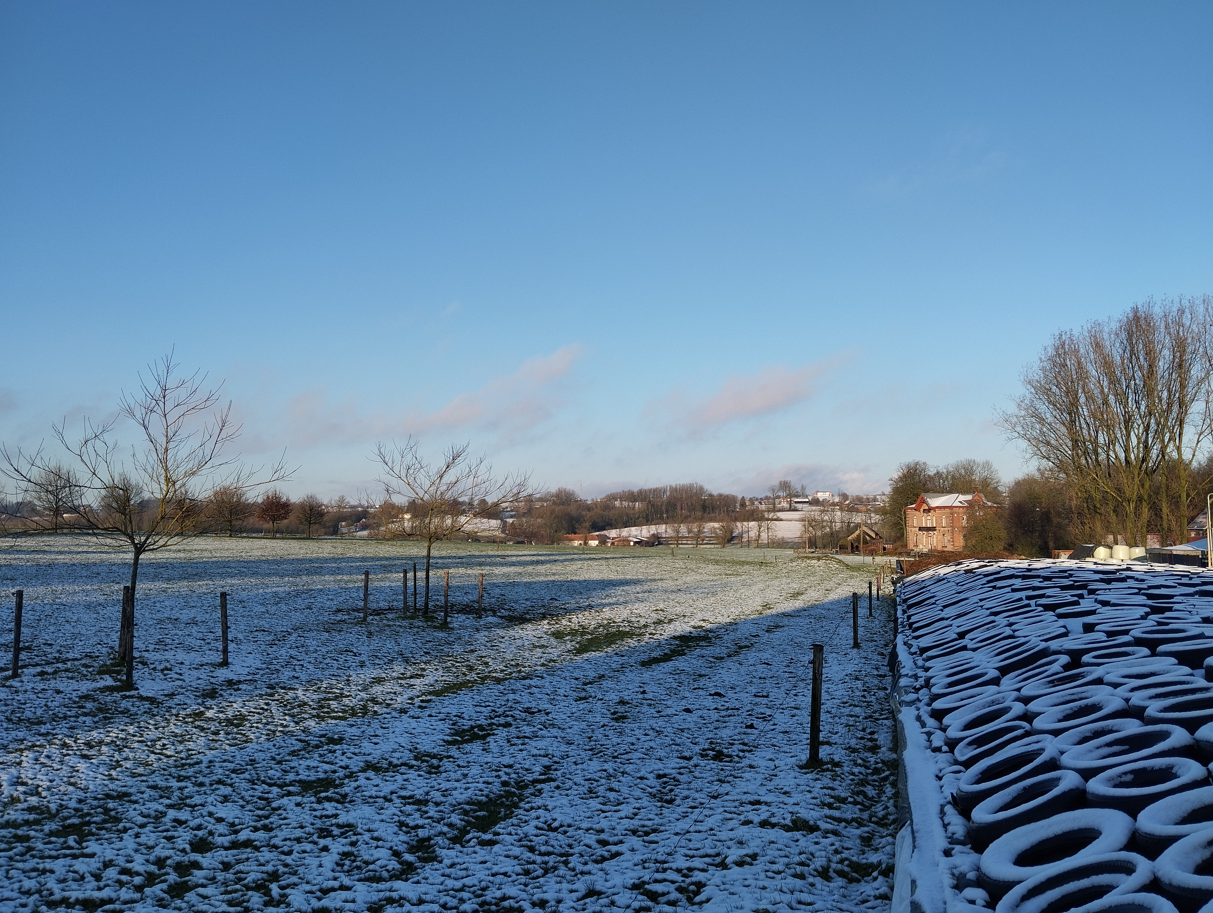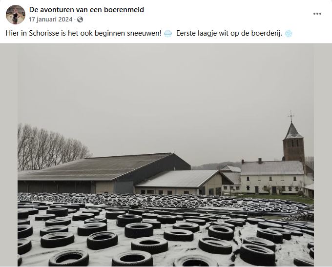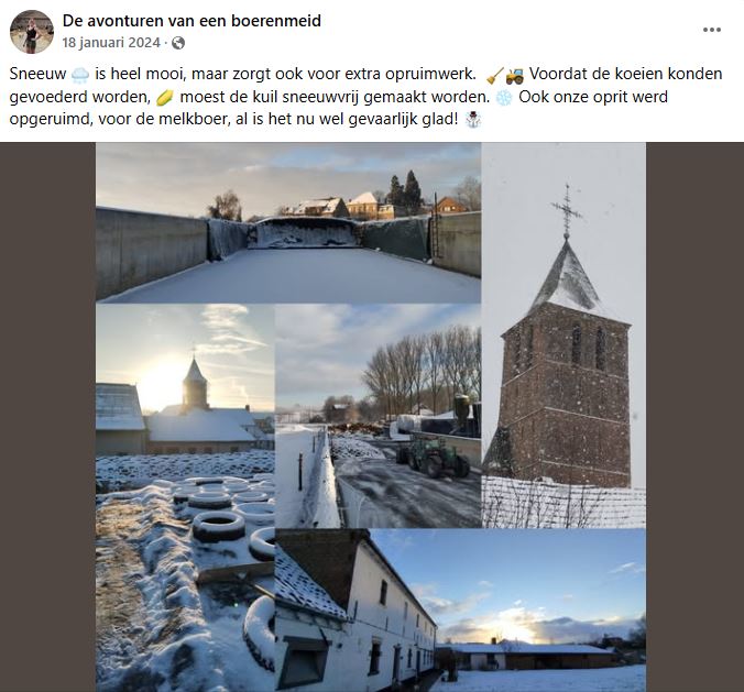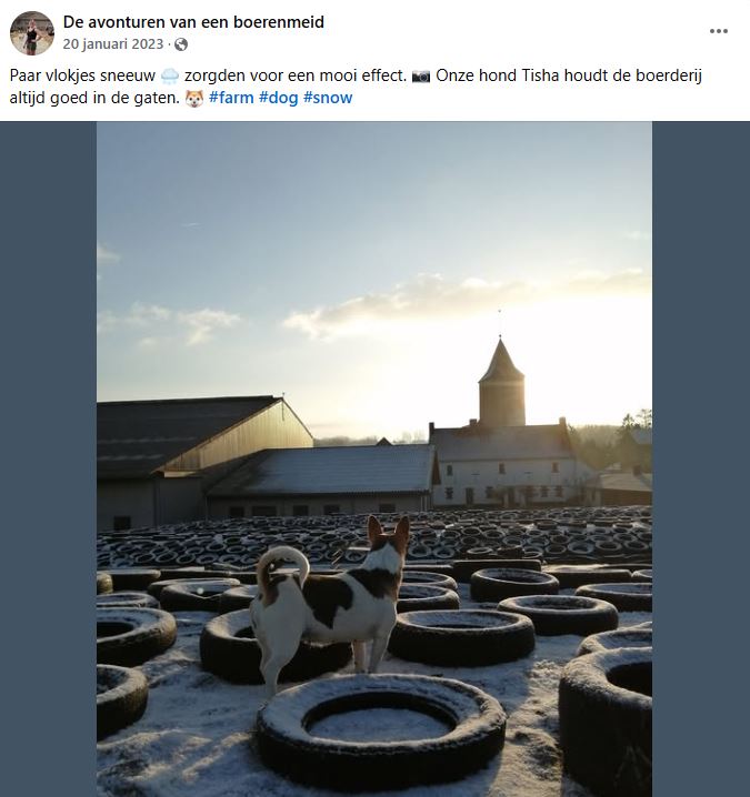 Naast m’n blog op het wereldwijde web heb ik sinds januari 2019 ook een Facebookpagina. Oorspronkelijk met de bedoeling om daar te zeggen wanneer er iets op m’n blog verscheen. Maar mettertijd gebruikte ik die pagina meer en meer door regelmatig foto’s te plaatsen. Ik vertelde kort over wat er op de boerderij gebeurde of welke avonturen ik buiten de boerderij beleefde. Nu kan ik zeggen dat je het snelst korte updates krijgt op m’n Facebookpagina. Op m’n blog werk ik bepaalde werkzaamheden en belevenissen dieper uit, met nog meer foto’s. Op 20 januari 2023 toonde ik op Facebook een foto van het beetje sneeuw dat toen was gevallen.