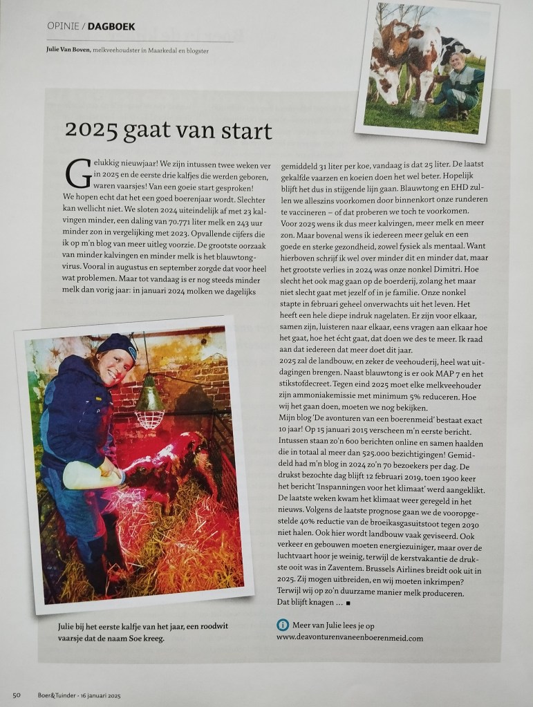 Het jaar 2025 zal de landbouw of toch al zeker de veehouderij heel wat uitdagingen brengen. Over de aanpak van blauwtong had ik het al. Maar er is ook een nieuw mestactieplan, MAP7, en dan zitten we uiteraard ook met het stikstofdecreet. Tegen eind 2025 moet elke melkveehouder zijn ammoniakemissie reduceren met minimum 5 %. Hoe wij het gaan doen, moeten we nog bekijken. Ik schrijf er later nog over hier of op m’n blog. M’n blog De avonturen van een boerenmeid bestaat exact 10 jaar! Op 15 januari 2015 verscheen m’n eerste blogbericht op het wereldwijde web. Intussen staan zo’n 600 berichten online en samen haalden die in totaal al meer dan 525 000 bezichtigingen! Gemiddeld had m’n blog in 2024 zo’n 70 bezoekers per dag. De drukst bezochte dag van m’n blog blijft 12 februari 2019, toen 1900 personen het bericht “Inspanningen voor het klimaat” aanklikten. De laatste weken kwam het klimaat ook weer geregeld in het nieuws: we gaan volgens de laatste prognose niet aan de vooropgestelde 40 % reductie van de broeikasgasuitstoot tegen 2030 raken. Ook hier wordt landbouw vaak geviseerd: de methaanuitstoot moet omlaag. Er werd ook wel met de vinger gewezen naar het verkeer en gebouwen die energiezuiniger moeten. Over de luchtvaart werd weinig gezegd, terwijl ik met eigen ogen zie en ook in het nieuws las: “drukste kerstvakantie ooit op Brussels Airport” en “Brussels Airlines breidt uit in 2025”. Zij mogen uitbreiden, en wij als boeren moeten inkrimpen? Terwijl wij op zo’n duurzame manier melk produceren. Dat knaagt bij mij. Daarover schrijf ik dus zeker ook nog eens in 2025.