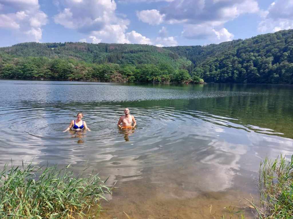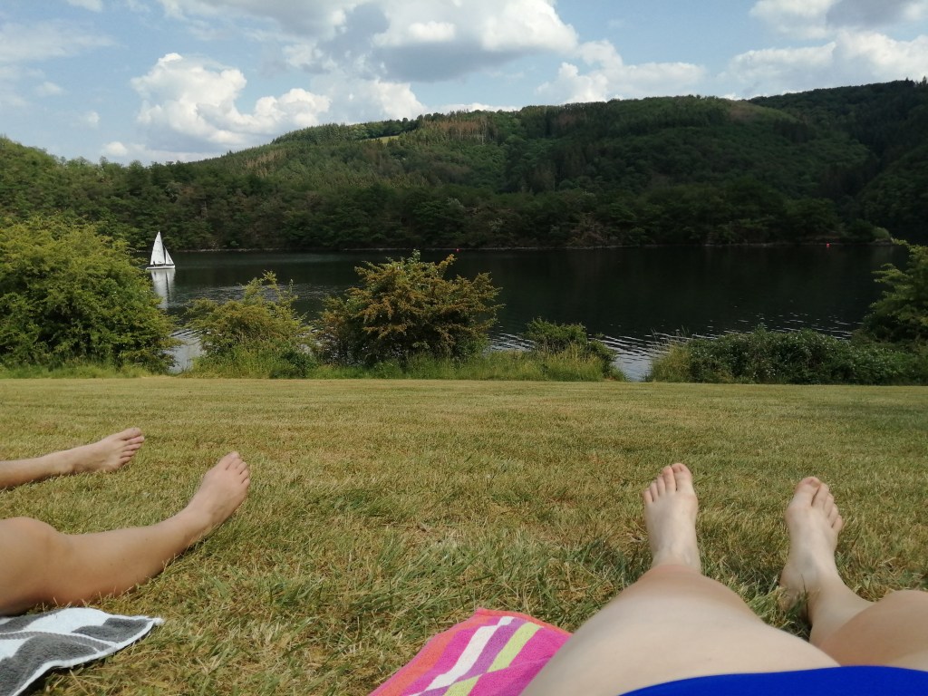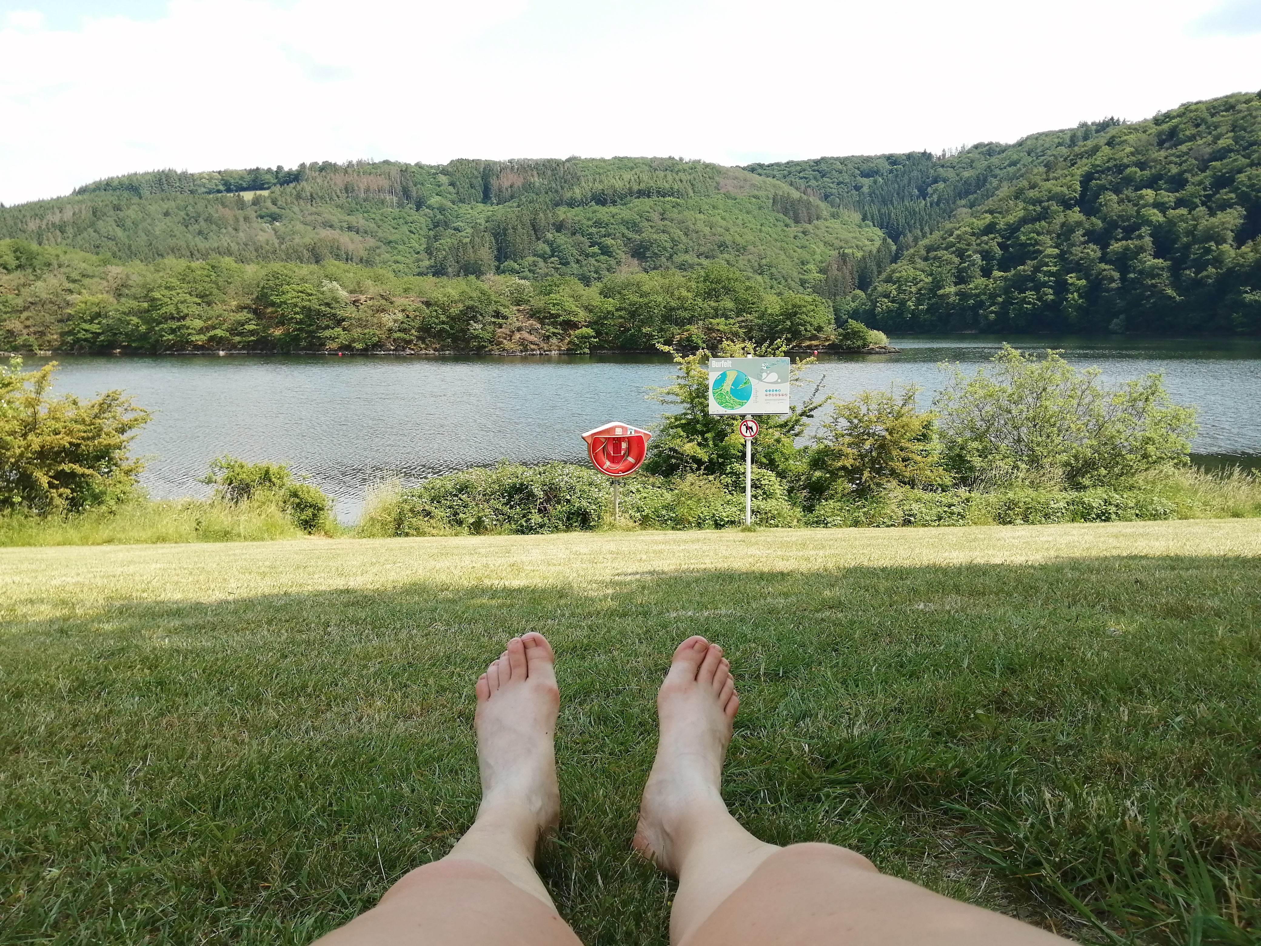 Hierboven op de foto zie je links van het water het Plage de Burfelt. Vanaf het uitkijkpunt is het zo’n 10 minuten stappen tot je er bent. Het is geen strand met zand, maar het is een kortgemaaid grasplein. Het loopt iets af naar het meer toe. Daar kan je rustig neerliggen en zonnen of onder een boom uitrusten. Je kan gaan zwemmen in het water, dat heel rustig en helder is. Heerlijk genieten hier. Echt een geweldige plaats. Op onderstaande foto zie je als je goed kijkt of inzoomt pal in het midden van de foto het panoramaplatform uitsteken van tussen de bomen.