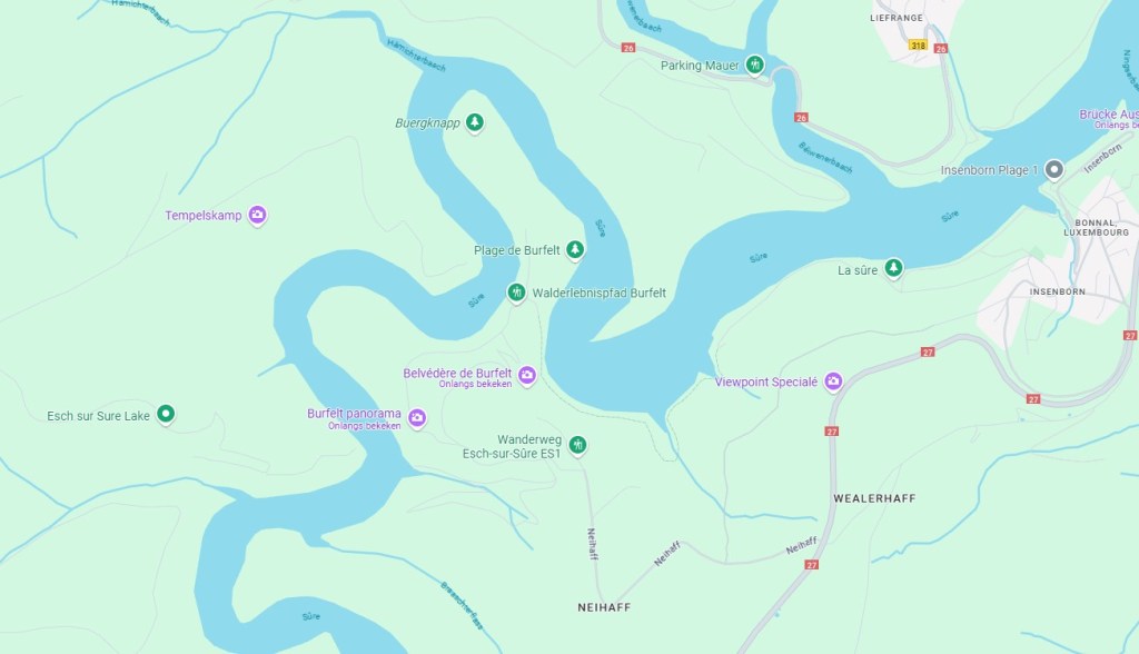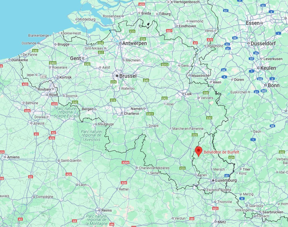 Ik toon eerst een kaart van de ligging van de Belvédère de Burfelt ten opzichte van België. Daarnaast heb ik ook een close-up kaart, waarop het Belvédère is aangeduid, alsook het Plage de Burfelt. Parkeren moet je trouwens doen op Neihaff, bij de aanduiding van Wanderweg Esch-sur-Sûre ES1. Van daar af is het te voet naar het uitkijkpunt en daarna nog verder afdalen tot het meer voor het Plage de Burfelt.