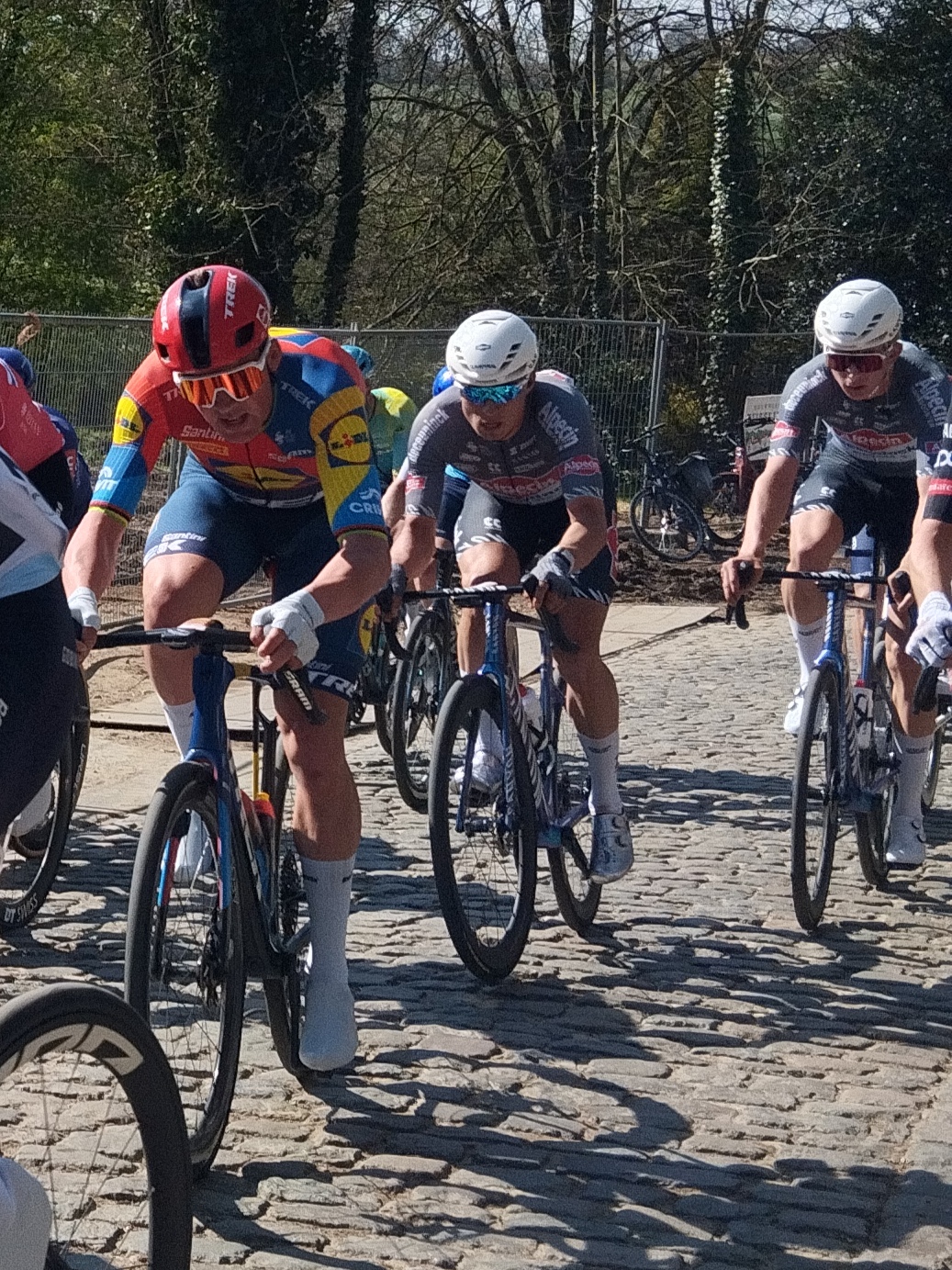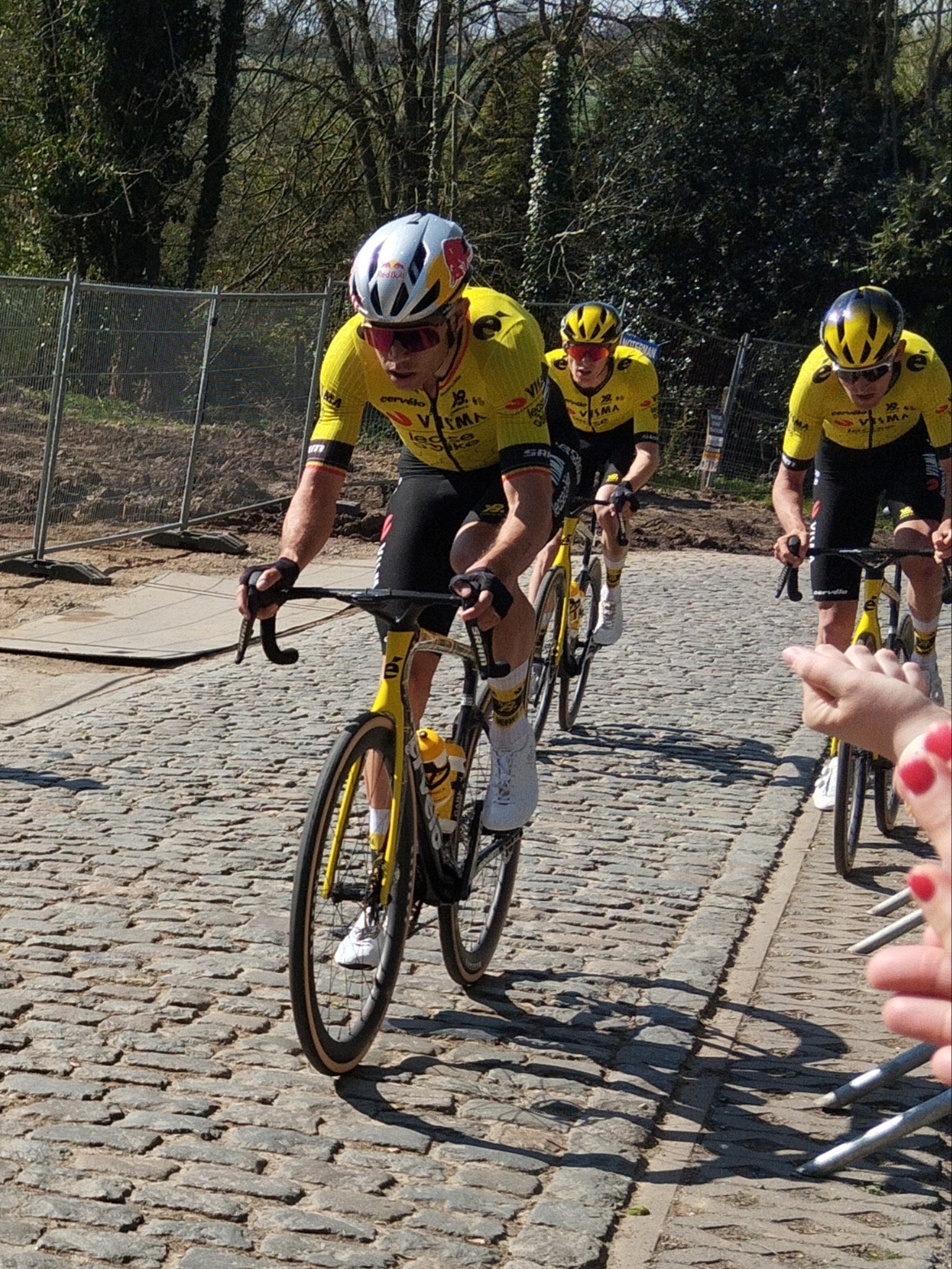 Wout van Aert en z’n ploegmaten Matteo Jorgenson en Tiesj Benoot voerden hier in de tweede passage de forcing. Ze waren echt indrukwekkend. De uiteindelijke winnaar zat hier nog niet vooraan. Ik heb hem op foto ook maar enkel van z’n achterkant. Maar dat is op zich ook al de moeite! 😉