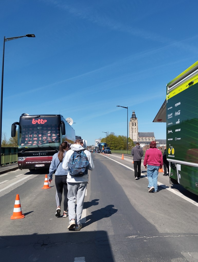 Vanaf de Eikenberg gingen we te voet naar de stadskern van Oudenaarde, dat is slechts 5 km verderop. We passeerden eerst tussen de bussen van alle ploegen. Op de Markt konden we dan de passage van de vrouwen meepikken. Op de foto rechts zie je rechtsboven Lotte Kopecky, zij kon een paar uur later opnieuw juichen! Zelf hebben we dat niet meer in Oudenaarde gezien want na de mannen moesten we terug naar huis want het was dan tijd om koeien te melken! Het leven van een boerin!
