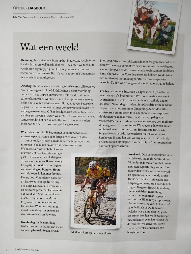 Half januari verscheen m’n eerste dagboek van 2025 in Boer&Tuinder: 2025 gaat van start. Daarover ging het onder andere over het vaccineren tegen blauwtong en het reduceren van onze ammoniakemissie. In m’n nieuw dagboek lees je daarover een nieuwe stand van zaken. Ik schreef het begin april, maar het verscheen uiteindelijk pas begin mei. Ik pakte het deze keer trouwens eens anders aan: ik beschrijf wat er in één week allemaal gebeurde op de boerderij maar dan echt dag per dag. Het was een mooie combinatie van werken en twee wielerwedstrijden die ik niet wou missen. We leven niet voor niets in het hart van de Vlaamse Ardennen! Over deze koersen lees en zie je trouwens meer in De Vlaamse Wielerweek.