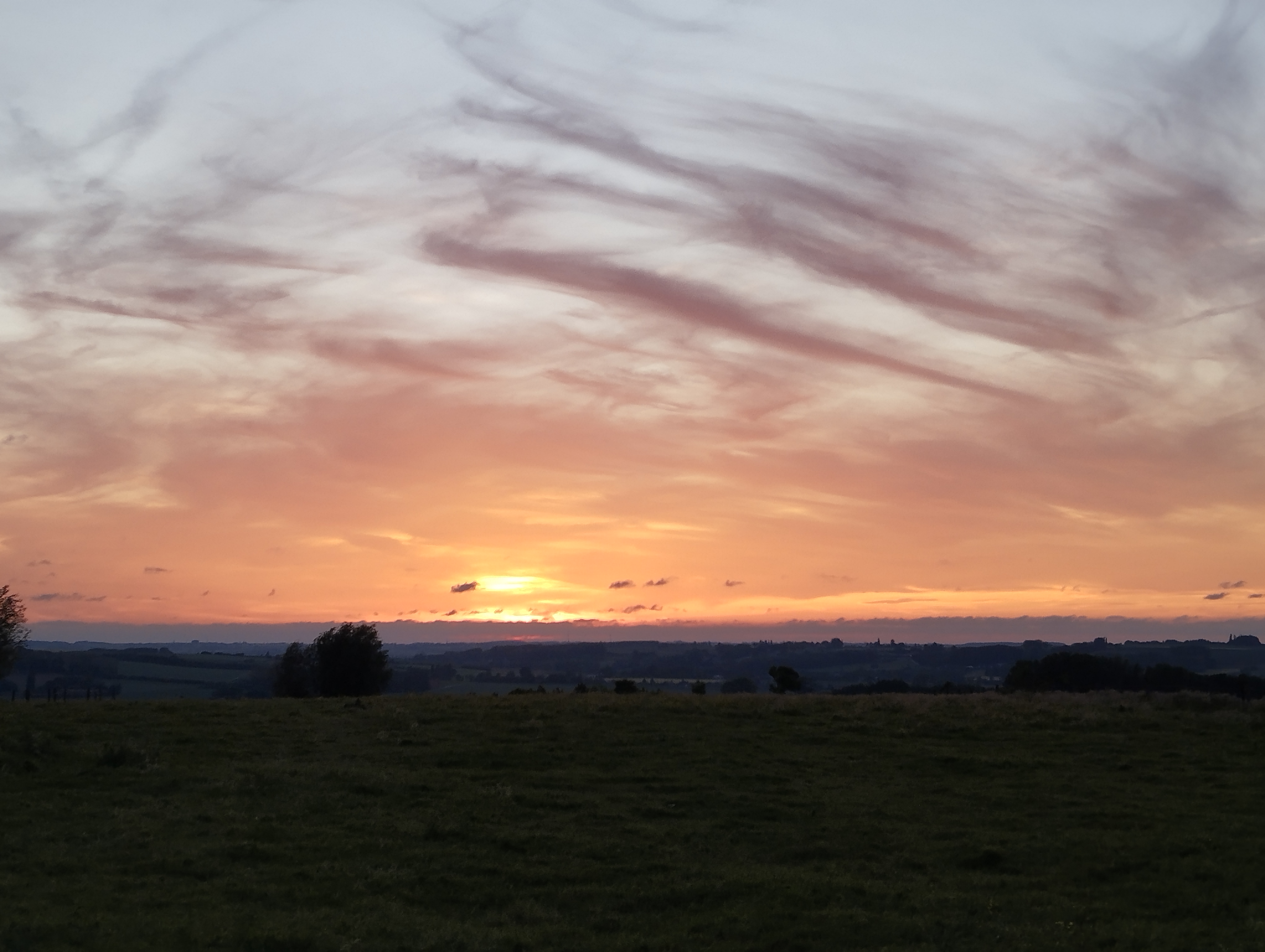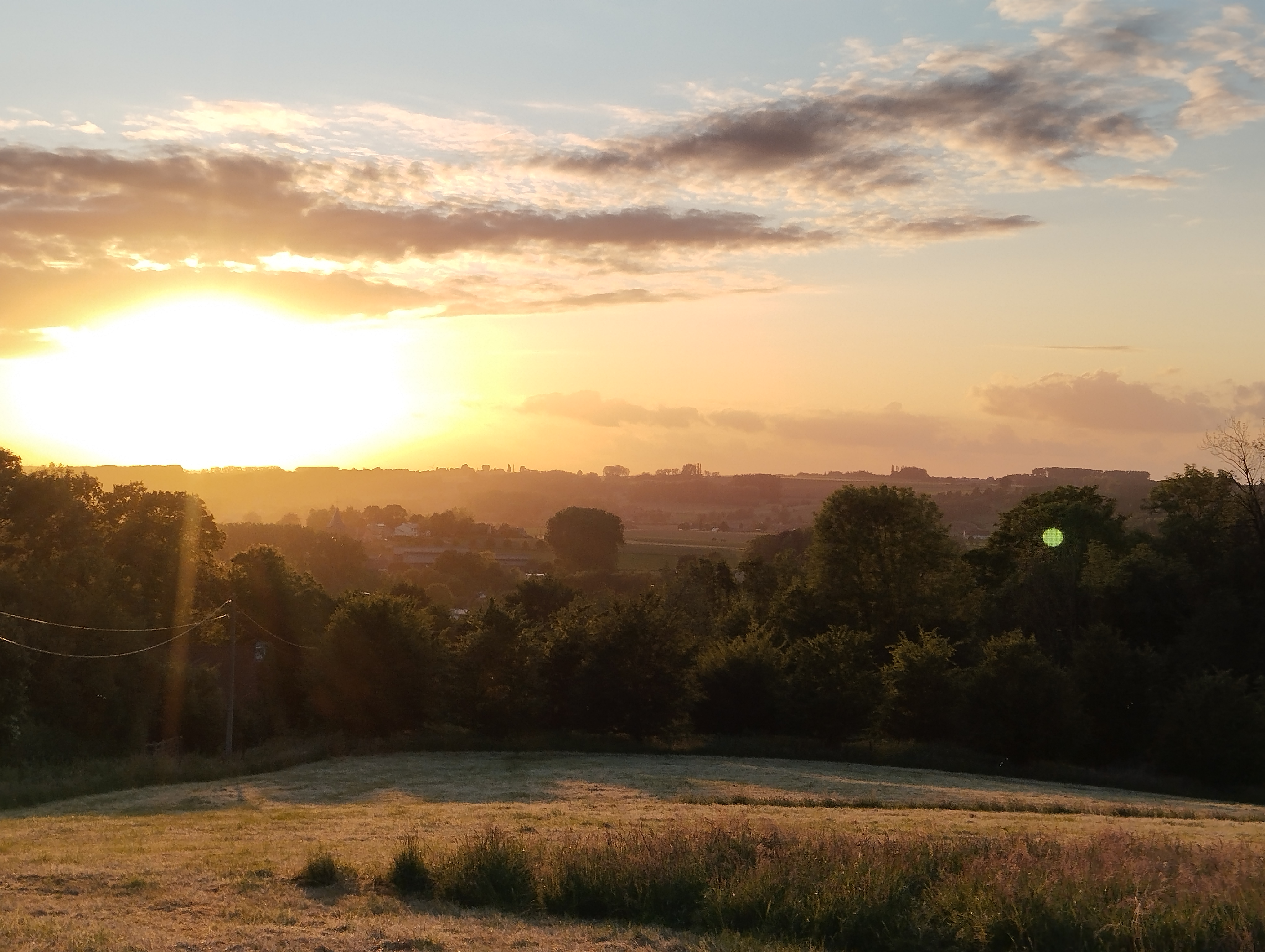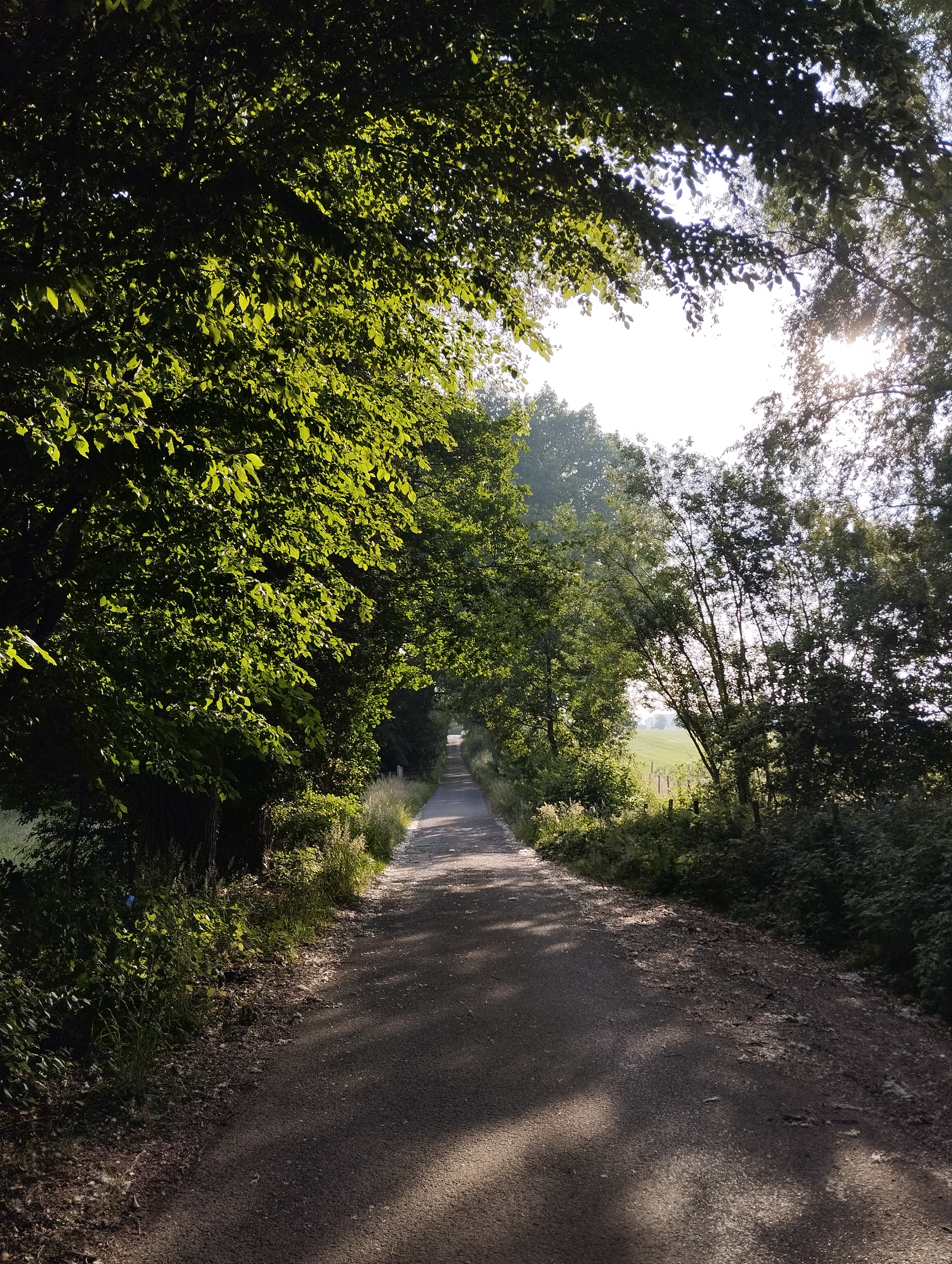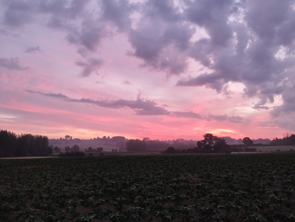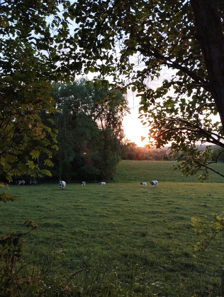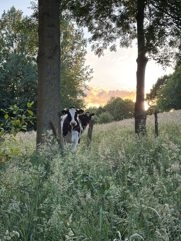 Tijdens een weekend kamperen in ons dorp eind mei ging ik ’s ochtends om en weer naar de boerderij om de koeien te melken. Rond 5u15 begon het klaar te worden en zag je de eerste kleuren die de zon aan de horizon deed verschijnen. Prachtig, toch?! Je ziet dan trouwens ook meerdere reeën rondhuppelen, al zijn deze overdag ook regelmatig te spotten. Rond 8u15 keerde ik terug naar de kampeerplaats, met verse melk, en toen scheen de zon al mooi! Dat zorgde voor de tweede foto, met de zon op en tussen de bomen.