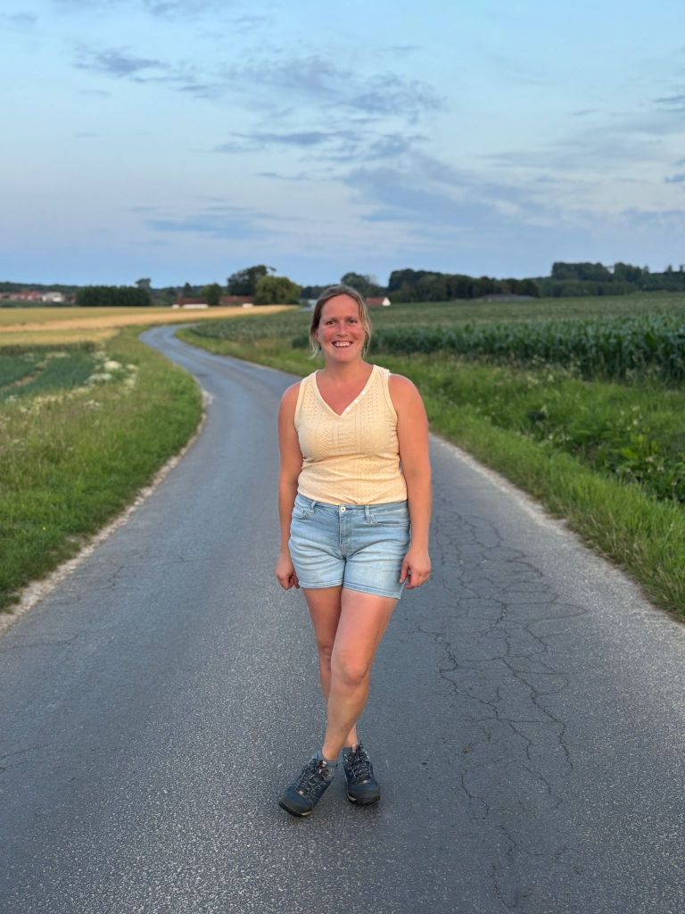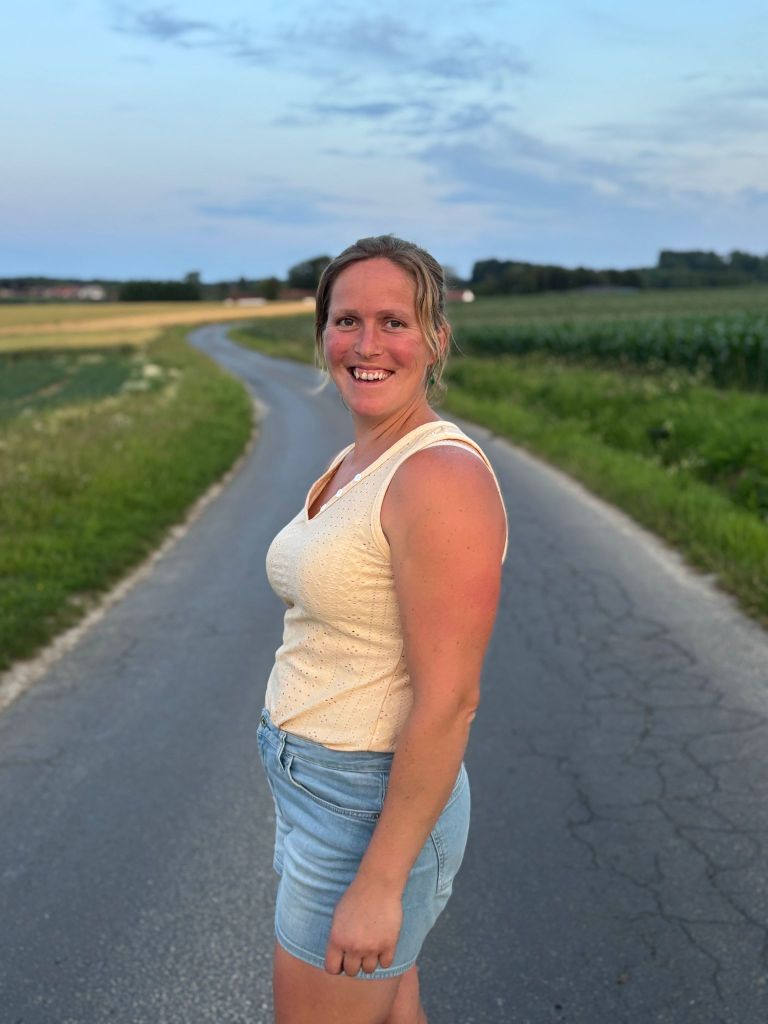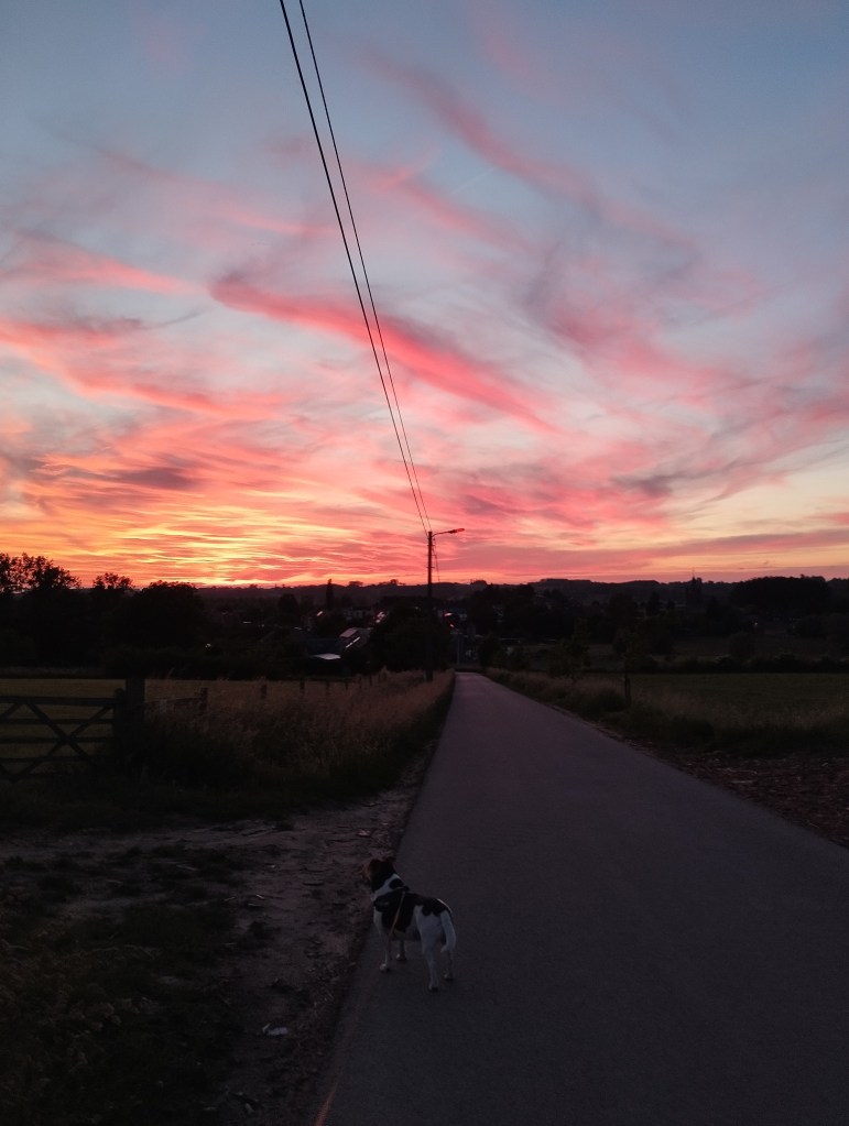 UPDATE Op 21 juni gingen Matthias en ik ook even kort wandelen in ons dorp. We genoten van een warme zomeravond en zagen de zon prachtig ondergaan. Genieten van de kleine dingen! Matthias kon enkele mooie foto’s van me nemen, met een kronkelend straatje op de achtergrond. Onze gemeente Maarkedal heeft trouwens alle borden met de straatnamen vernieuwd: het zijn nu groene bordjes met in het wit de straatnaam in een modern lettertype. Het past heel mooi bij onze landelijke gemeente.