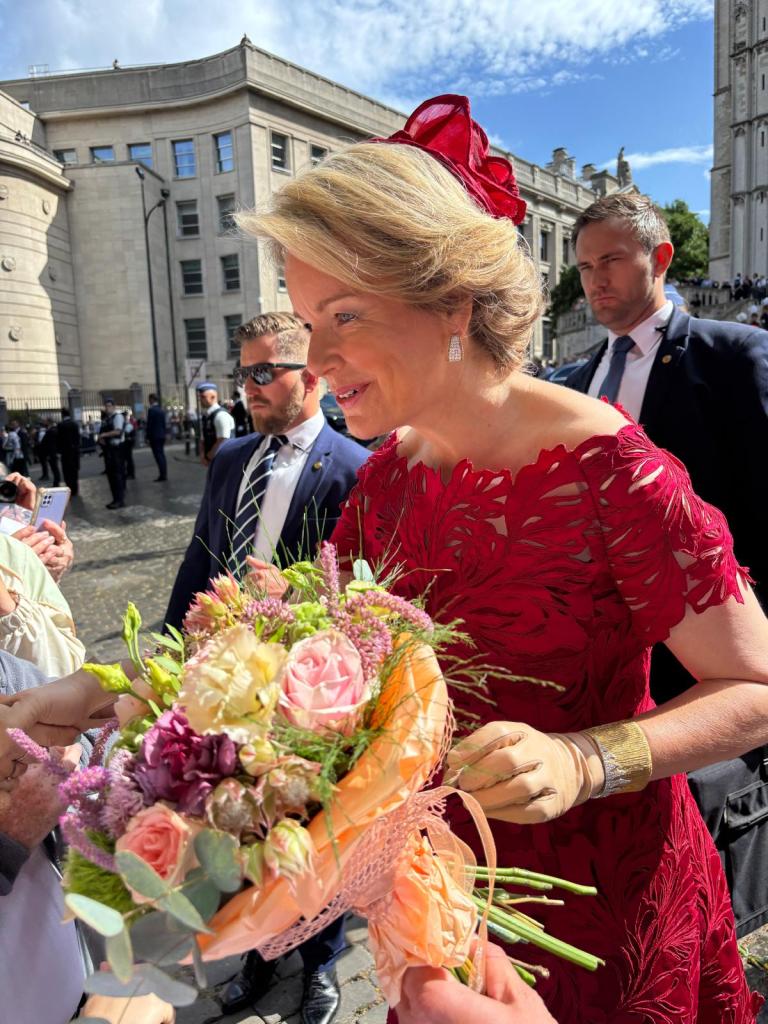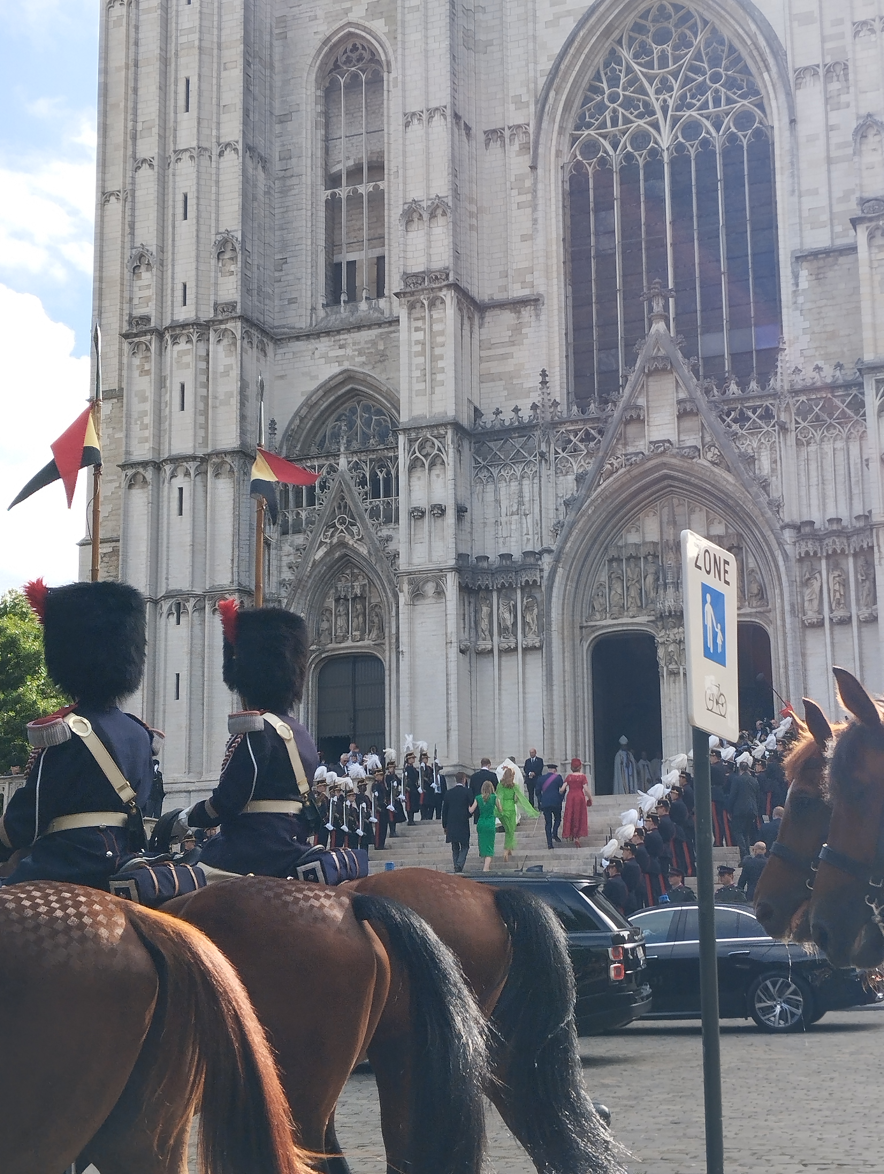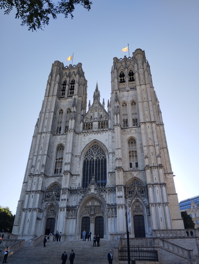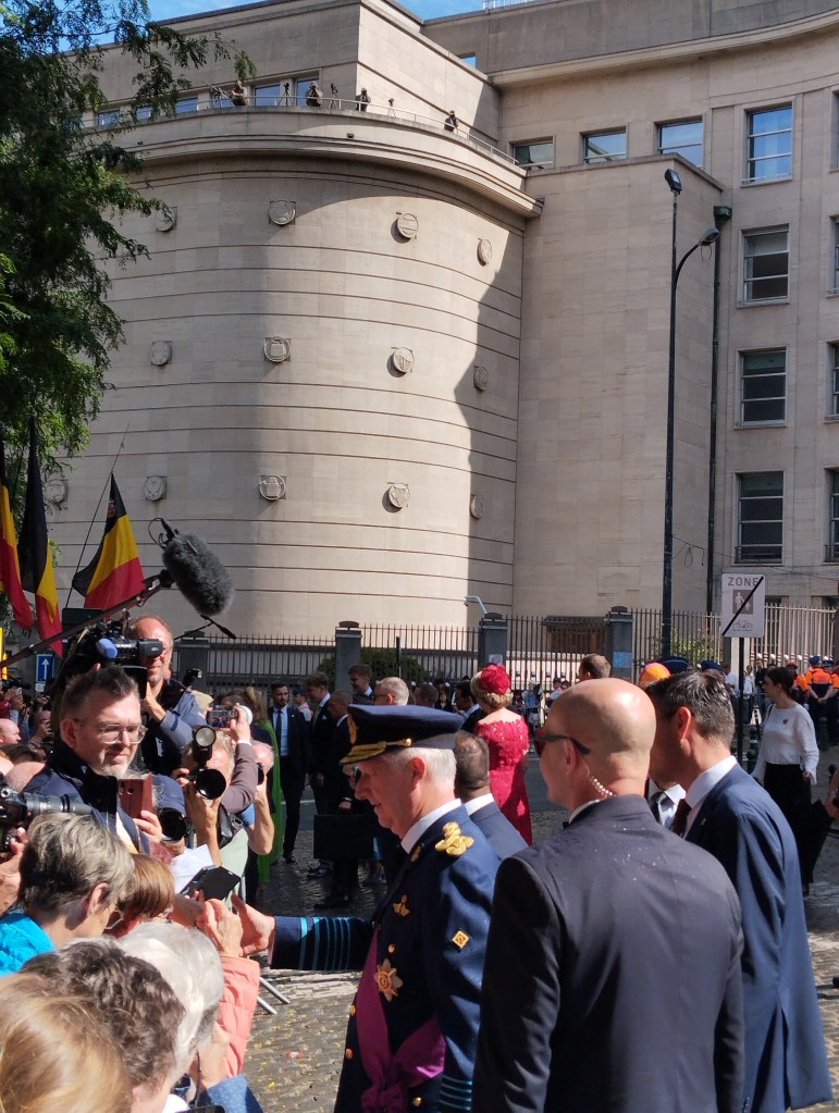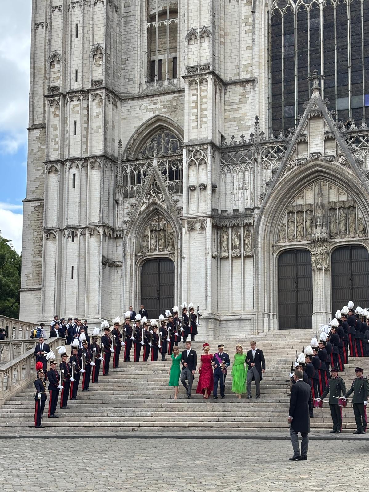 Op maandag 21 juli 2025 gingen Matthias en ik de Koninklijke Familie opwachten aan de kathedraal van Sint-Michiel en Sint-Goedele. Het was opnieuw een prachtige dag – al kregen we ook een paar druppels, maar die namen we er graag bij. We vertrokken vroeg: om 7 uur ’s ochtends kwam Matthias me oppikken onder de kerktoren van Schorisse. Ik had eerst al een uur gewerkt, maar daarna deden m’n ouders verder met melken. Om half 9 stonden we al onder de kathedraal van Sint-Michiel en Sint-Goedele in Brussel. Van dorp naar stad, van kerk naar kathedraal, een groot verschil.