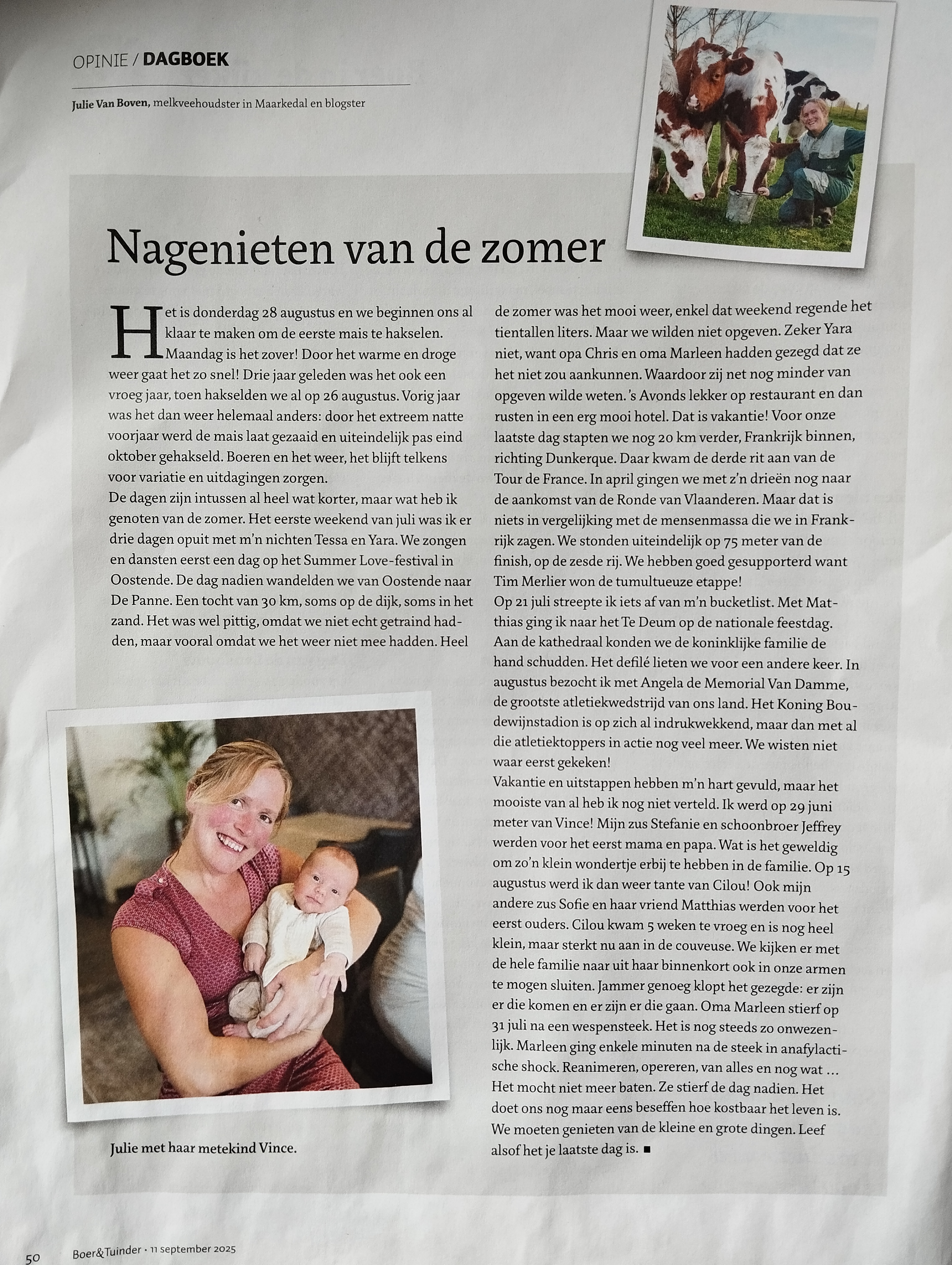 M’n derde dagboek van 2025 verscheen op 11 september in Boer&Tuinder. Ik schreef het eind augustus en vertelde over wat er in de zomer allemaal gebeurde. Het is het vervolg op Feels like summer dat eind juni werd gepubliceerd. Het werd een zomer met heel wat gebeurtenissen, waar vreugde en verdriet, waar leven en dood, echt heel dicht bij elkaar lagen. Ik sluit dan ook af met de zin: “Leef alsof het je laatste dag is.”