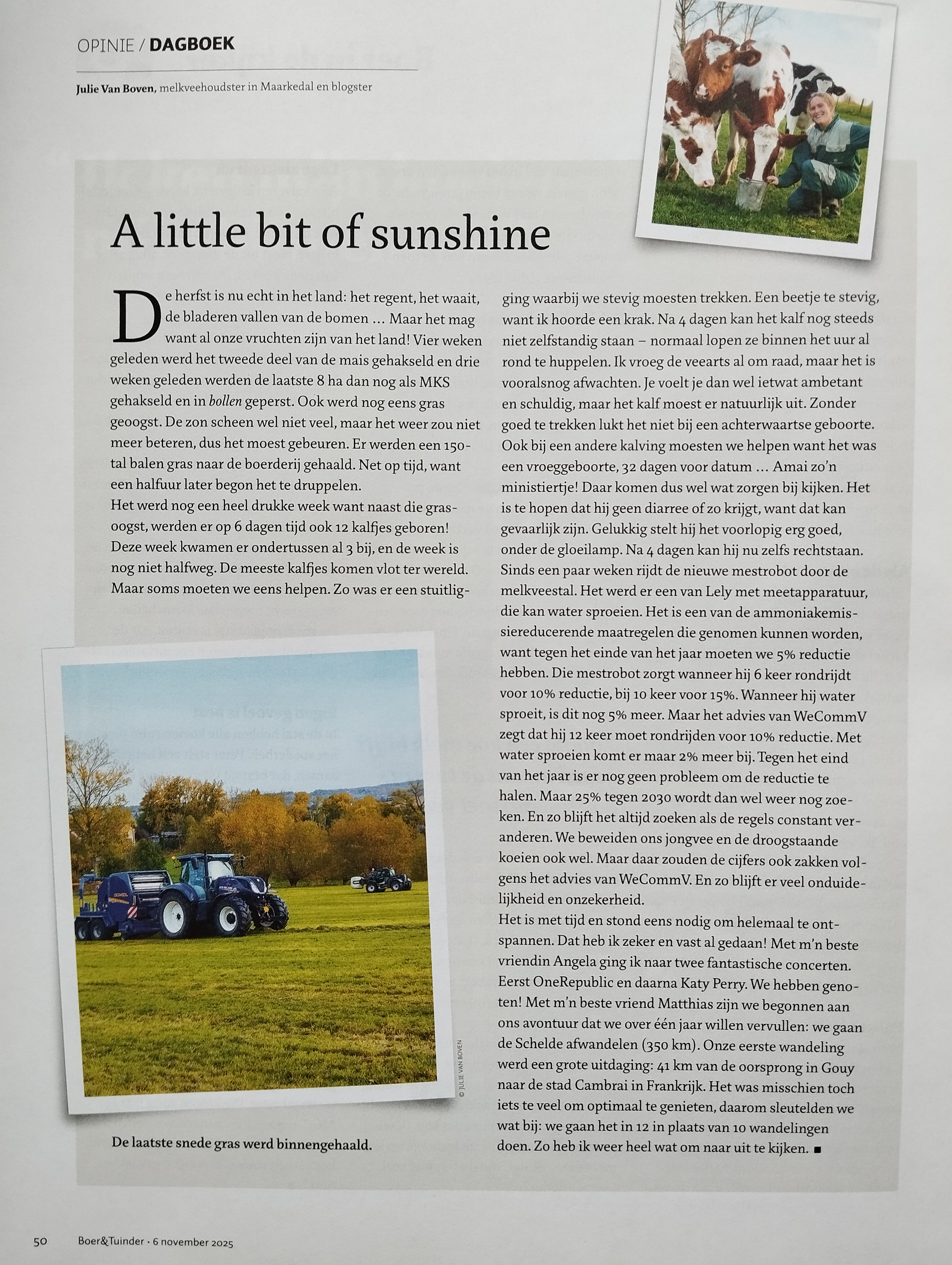 Op 6 november verscheen m’n vierde dagboek van 2025 in Boer&Tuinder. Ik schreef het reeds op 22 oktober. Ik gaf een update over de werkzaamheden op de boerderij: alle maïs was geoogst, er werden heel wat kalfjes geboren én de nieuwe mestrobot werd geïnstalleerd! Het werk werd afgewisseld met ontspanning: ik zag optredens van OneRepublic en Katy Perry! De titel van m’n dagboek en dit bericht is trouwens een titel van een lied van OneRepublic. Het klopte dus helemaal, met wat ik beleefde en met het weer. Ik vertelde op het einde ook dat ik, samen met m’n maatje Matthias, aan een nieuwe wandeluitdaging ben begonnen.