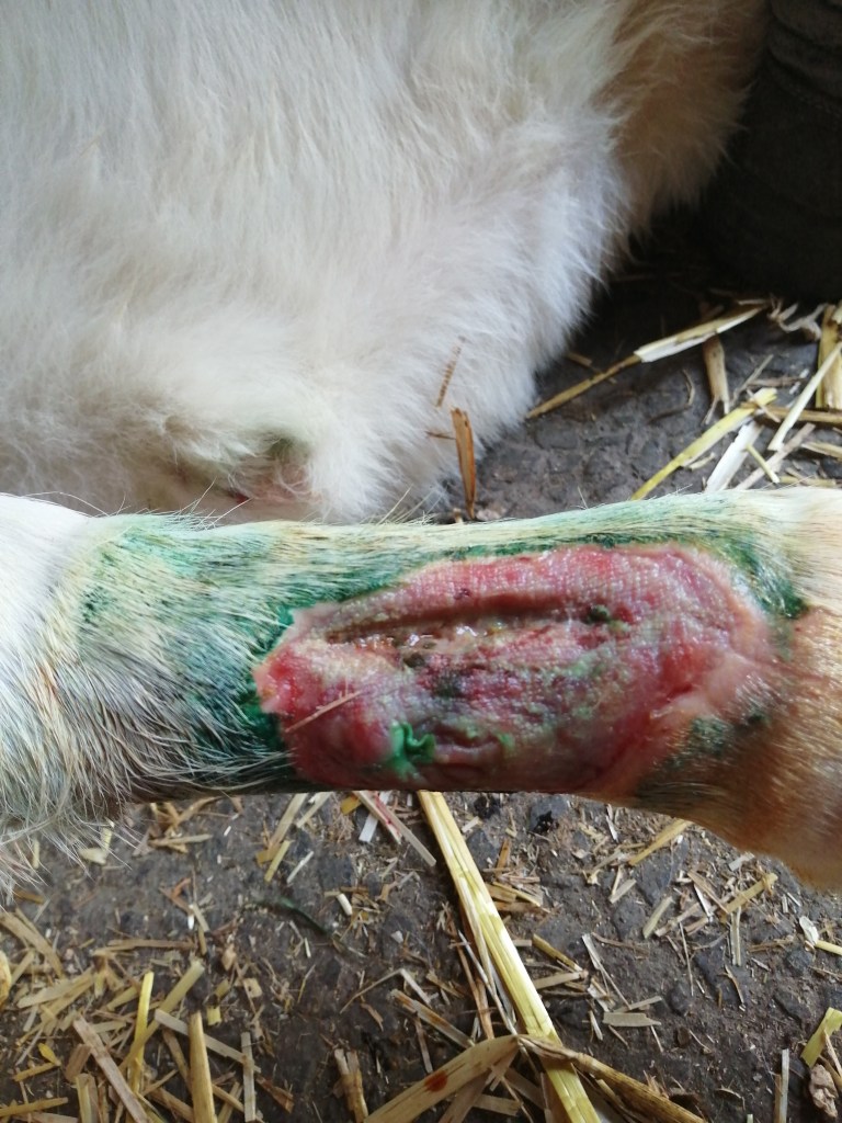 Bovenstaande foto’s zijn genomen op 7 juli. Het was veearts Jakob, toen van DAP ’t Perlinck, die enkele keren langskwam om de verzorging te doen. Hij had er niet echt een goed oog op. De kans op (ernstige) ontsteking was erg groot. Serena kreeg dan ook ontstekingsremmer en antibiotica toegediend. De komende dagen en weken heb ik het verband regelmatig vervangen. Door vol te houden en goed te blijven verzorgen, verbeterde het beetje bij beetje.
