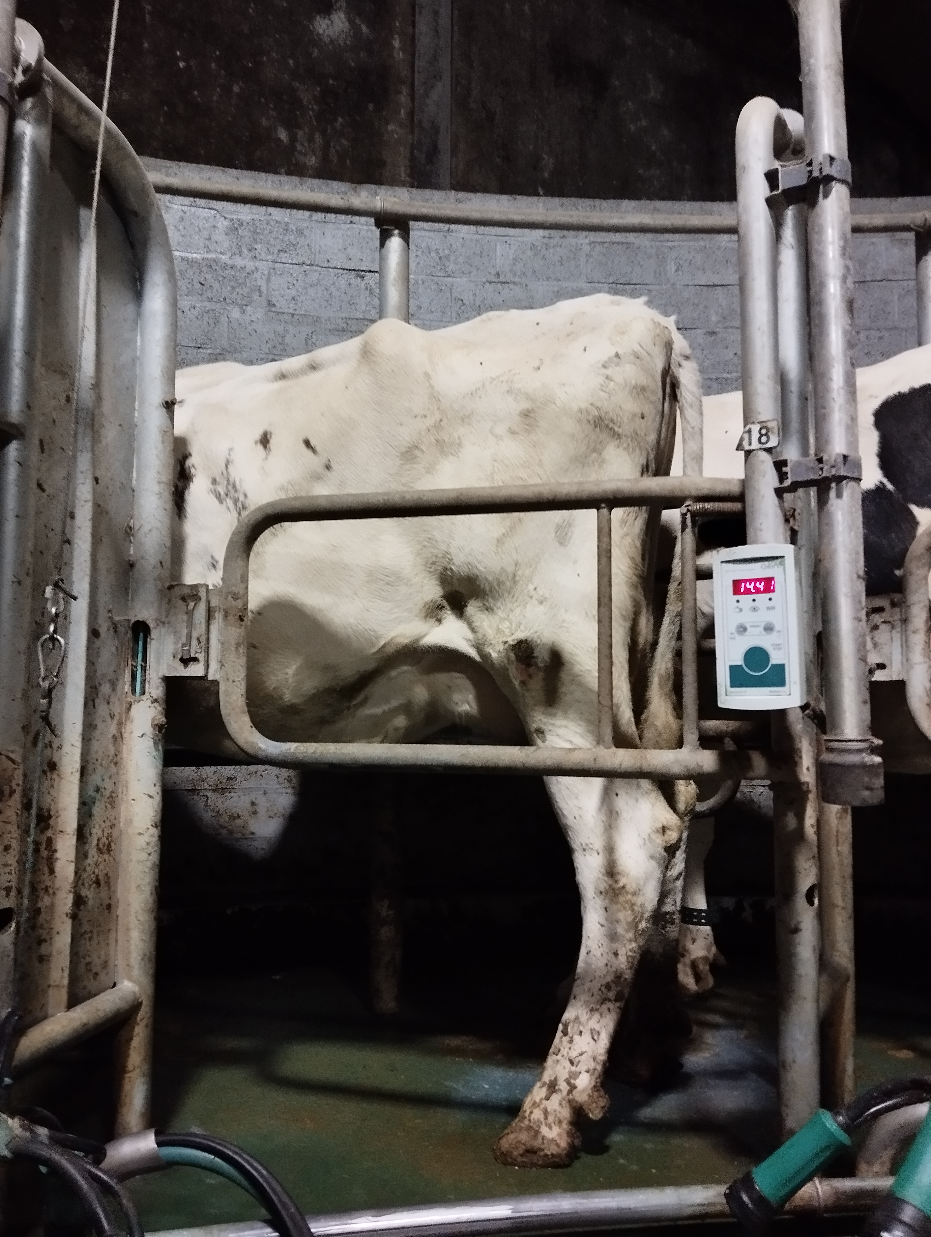 Intussen is ze 5,5 maand aan de melk én alweer 4 maand drachtig! Hieronder zie je haar in de carrousel, waar ze per melkbeurt nog een 14-tal liter geeft. Ze ziet er wel scherp uit op deze foto maar dat komt wel wat door de hoek waaruit de foto genomen is. Natuurlijk is ze van nature ook wel een klein, fijn koetje. Fijn op twee manieren, zo hebben we ze graag!