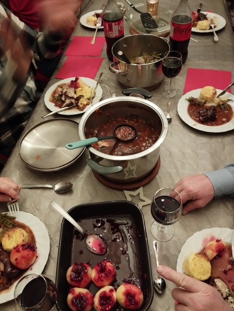 Kerstavond wordt altijd bij ons thuis op de boerderij gevierd. In de namiddag is het eerst opruimen en stofzuigen. Daarna een tafel en stoelen verhuizen, zodat iedereen een mooi plaatsje heeft en we niet krap moeten zitten. Dan volgt de tafel zetten: borden, bestek, glazen, servetten, kaarsjes, versiering… Dit doe ik terwijl m’n moeder al aan het koken is. De voorbereidingen voor vanavond: coq au vin staat op het menu. Ondertussen heb ik een cd opgelegd met kerstliedjes: heerlijk!