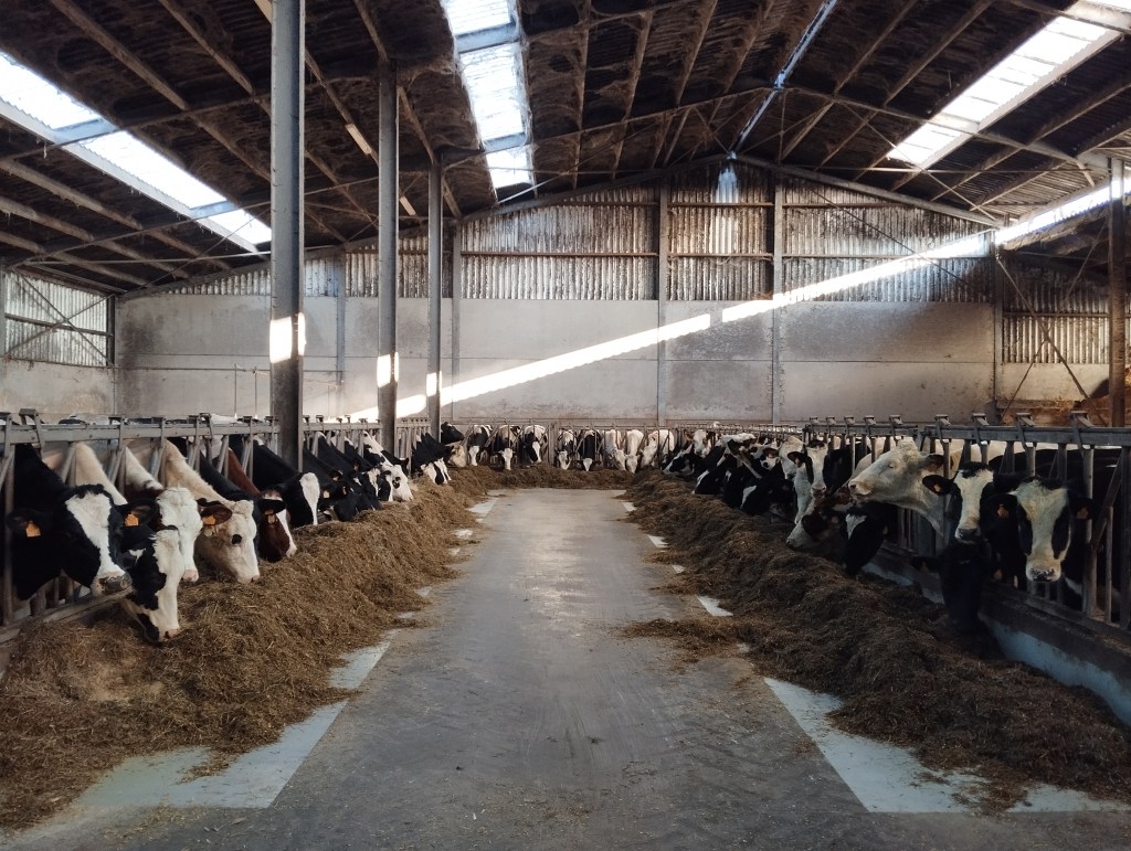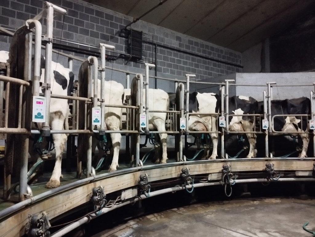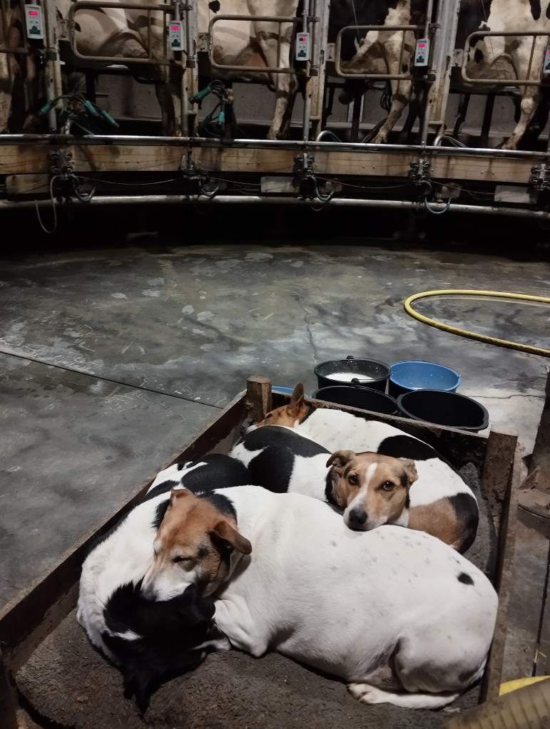 Na een koffiepauze met een koekje beginnen we een goed half uur vroeger dan gewoonlijk aan het werk. Veel vroeger doen we niet, want dan moet je ’s ochtends ook vroeger zijn. Onze honden zijn er ook bij tijdens het melken, lekker knus in hun bedje. We hebben geluk: alles verloopt vlot, geen koeien gekalfd en geen om te insemineren. Een groot verschil met 7 jaar geleden, toen we een extreem drukke periode van kalvingen hadden rond kerst en nieuw. We geven nu nog de kalveren melk en zorgen dat iedereen aan z’n voeder kan door het eens bij te schuiven of in de bakken te scheppen.