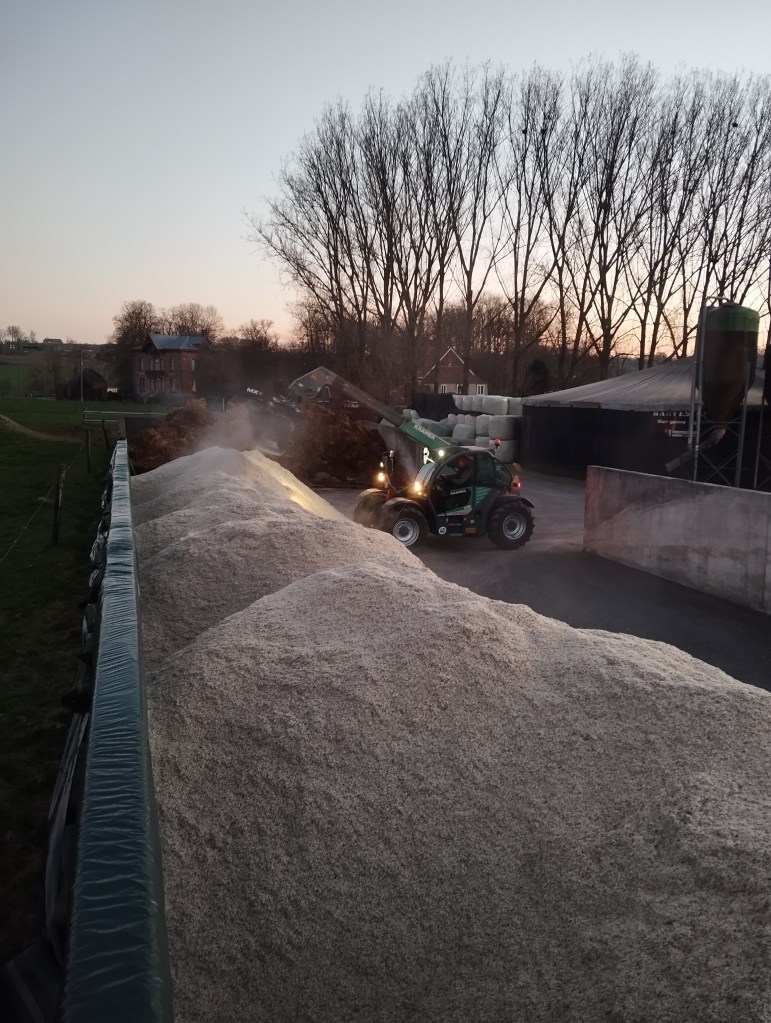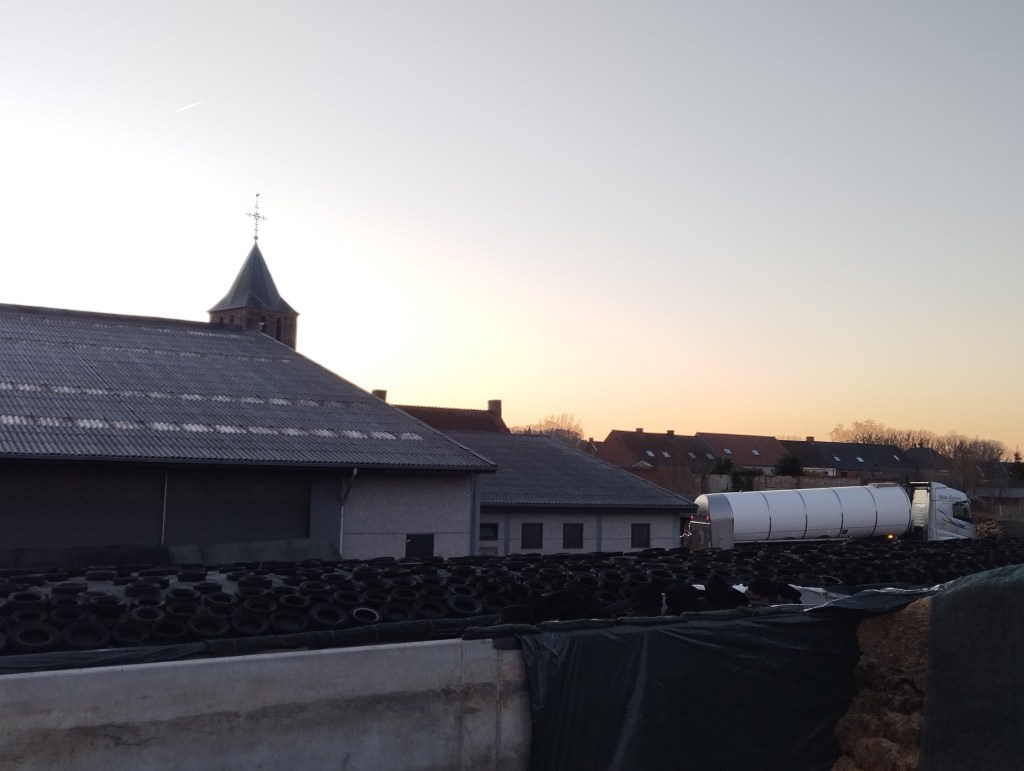 Op Kerstmis werd het nog een drukke dag want vanaf 6 uur zou de perspulp geleverd worden. Daar hield m’n vader, boer Herman, zich met bezig. Want m’n moeder, boerin Veerle, en ik moesten weer de koeien melken. Het verliep opnieuw vlot en dan zijn we blij. Want vanaf er een kalving of inseminatie moet gebeuren, ben je al sneller een kwartier tot half uur langer bezig. Vandaag kwam de melkerij ook de melk ophalen en dus zijn we beter op tijd want rond 8u zijn ze er al. Na het ontbijt is het terug verder werken: voor wij kunnen gaan eten, moeten de dieren gevoederd worden. Intussen werden er nog enkele camions perspulp geleverd. Dat werk gaat ook verder op feestdagen. Drie jaar geleden kwamen ze leveren op de eerste dag van het jaar. Het was nu trouwens een koude Kerstmis, temperatuur rond of zelfs net onder het vriespunt, maar wel met zon! Zelfs in de stal was er een streepje zon te zien.