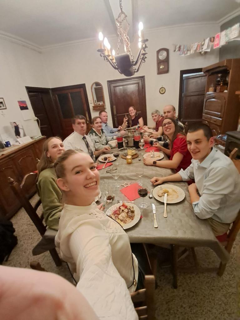 Na ons te hebben gewassen, komt ons volk rond 20 uur toe. Nonkel Raf, de broer van m’n papa, en zijn gezin komen elk jaar. Van m’n zussen komt wie kan komen. Dit keer enkel zus Stefanie en schoonbroer Jeffrey met m’n metekindje Vince. De pakjes liggen klaar onder de kerstboom, voor later op de avond. We beginnen eerst met de chipjes en de hapjes én een glaasje cava. Daarna de hoofdschotel, geen voorgerecht of soep want zo ’s avonds laat is dat anders te veel. Nichtje Yara nam een leuke selfie met iedereen op de foto! Links van haar trouwens haar zus Tessa, rechts van haar haar vriendje Inyo, die op zijn beurt dan weer de broer is van schoonbroer Jeffrey. Het blijft in de familie. 😉 Geen voorgerecht maar wel nagerecht: ijstaart als dessert kan er altijd bij! Tot rond 12 uur vieren we feest en genieten we van al het lekkers en van elkaar. Maar dan houden we het voor bekeken want ’s ochtends volgt het werk opnieuw én is het kerstfeest met de andere familie.