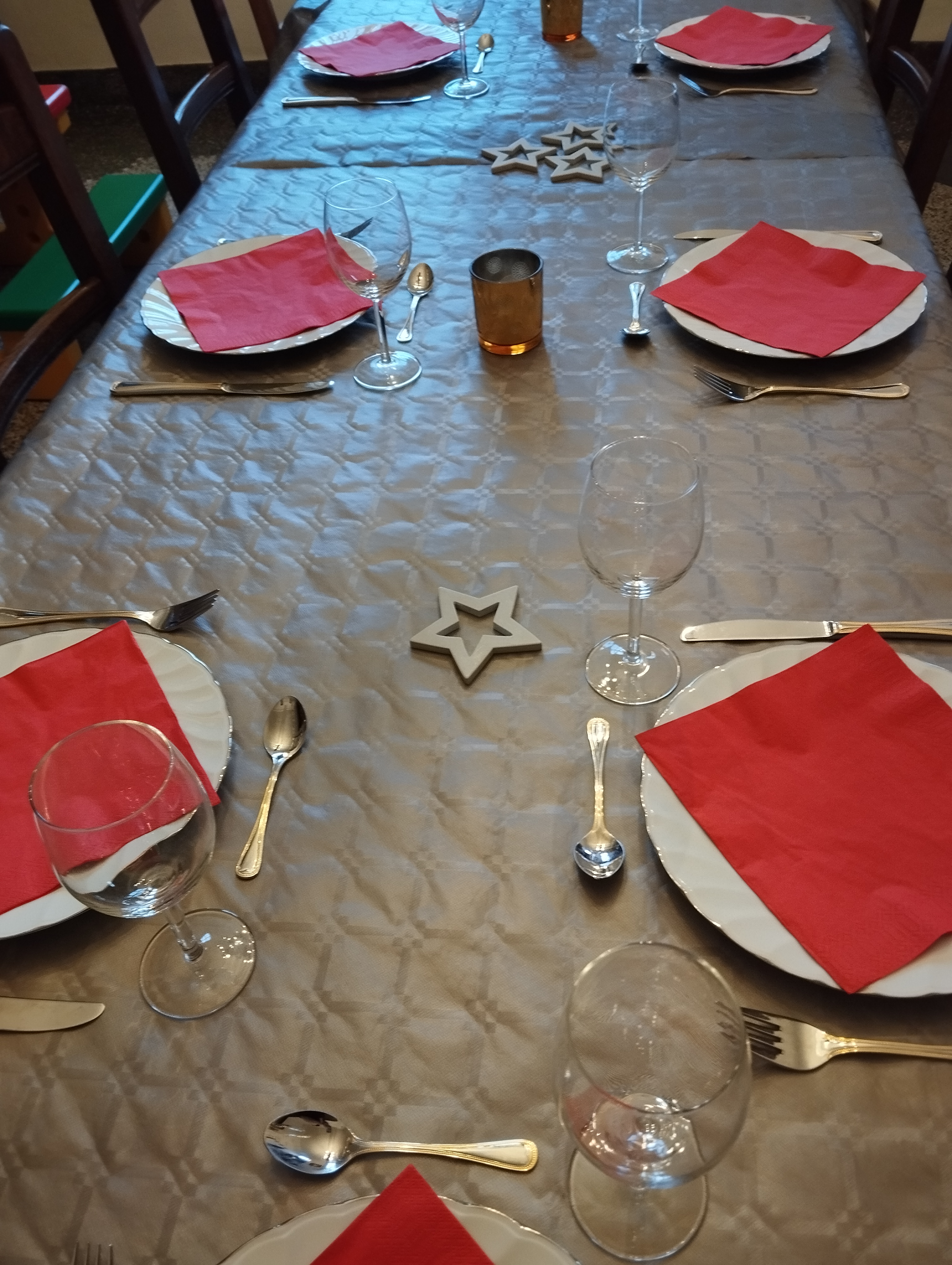 Kerstavond wordt altijd bij ons thuis op de boerderij gevierd. In de namiddag is het eerst opruimen en stofzuigen. Daarna een tafel en stoelen verhuizen, zodat iedereen een mooi plaatsje heeft en we niet krap moeten zitten. Dan volgt de tafel zetten: borden, bestek, glazen, servetten, kaarsjes, versiering… Dit doe ik terwijl m’n moeder al aan het koken is. De voorbereidingen voor vanavond: coq au vin staat op het menu. Ondertussen heb ik een cd opgelegd met kerstliedjes: heerlijk!