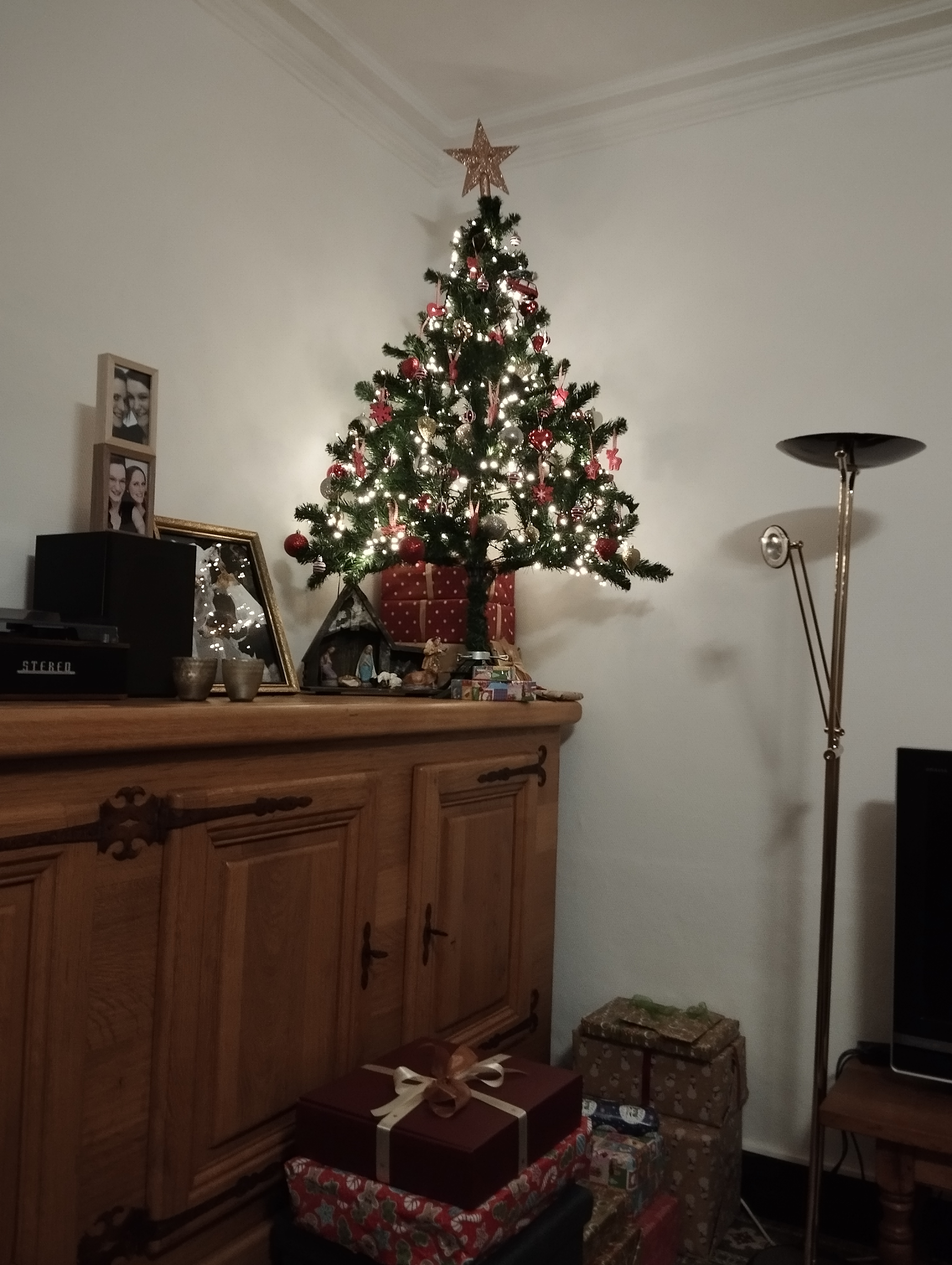Na ons te hebben gewassen, komt ons volk rond 20 uur toe. Nonkel Raf, de broer van m’n papa, en zijn gezin komen elk jaar. Van m’n zussen komt wie kan komen. Dit keer enkel zus Stefanie en schoonbroer Jeffrey met m’n metekindje Vince. De pakjes liggen klaar onder de kerstboom, voor later op de avond. We beginnen eerst met de chipjes en de hapjes én een glaasje cava. Daarna de hoofdschotel, geen voorgerecht of soep want zo ’s avonds laat is dat anders te veel. Nichtje Yara nam een leuke selfie met iedereen op de foto! Links van haar trouwens haar zus Tessa, rechts van haar haar vriendje Inyo, die op zijn beurt dan weer de broer is van schoonbroer Jeffrey. Het blijft in de familie. 😉 Geen voorgerecht maar wel nagerecht: ijstaart als dessert kan er altijd bij! Tot rond 12 uur vieren we feest en genieten we van al het lekkers en van elkaar. Maar dan houden we het voor bekeken want ’s ochtends volgt het werk opnieuw én is het kerstfeest met de andere familie.