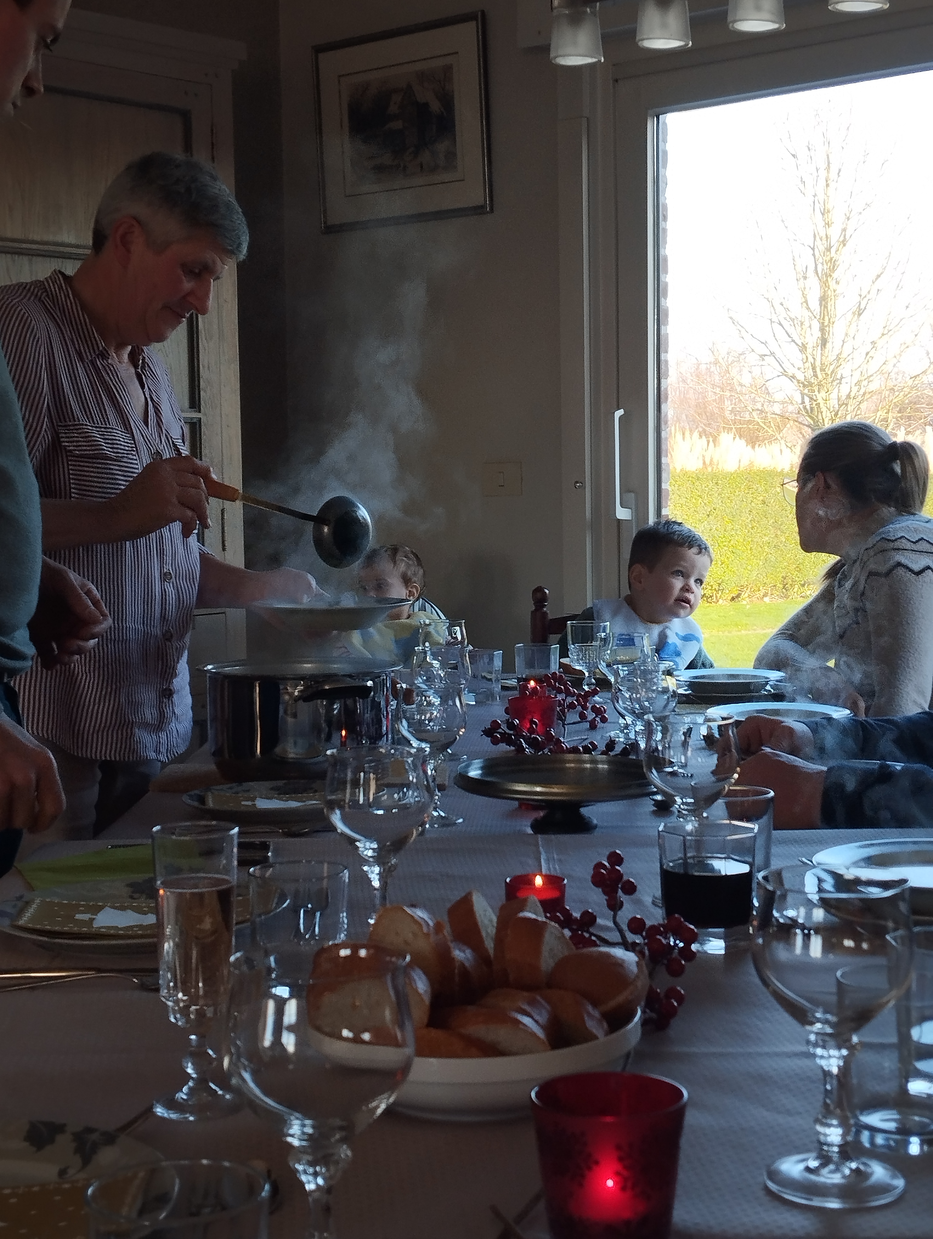 Op Kerstmis was het kerstfeest bij tante Kathleen, de zus van m’n mama. Haar twee dochters, m’n nichten Eline en Jelke, kwamen en al m’n zussen ook. M’n drie zussen en nicht Jelke hebben allemaal één kindje: vier kleine boelekes dus op het kerstfeest! Victor, Achiel, Vince en Cilou stonden in het middelpunt van de belangstelling en dat is fijn zo. Hier had iedereen van de familie iets voorzien voor het feest. Vele handen maken lichter werk. Ik zorgde ervoor dat niemand dorst had. 😉