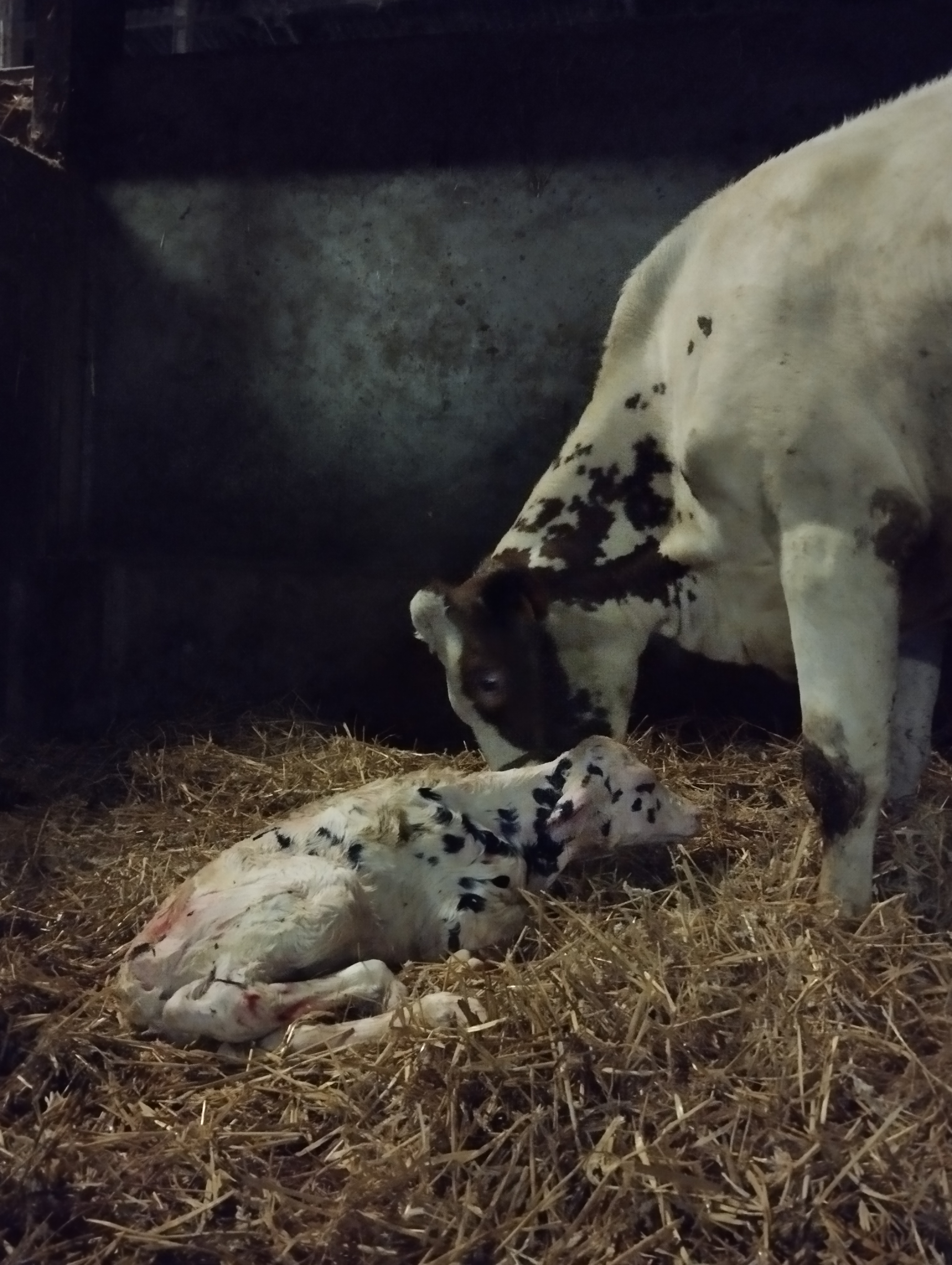 Rond 18 uur staan we terug in de stal. De laatste loodjes, want nu zijn we net als de hondjes toch wel moe. Zij zijn er altijd bij en geven ons een lach op het gezicht om verder te werken. Het werd uiteindelijk nog een lange avond want er bleek nog een koe bezig met kalven. We moesten eens voelen en het was niet goed: ik voelde het poepje en de pootjes bleven achter. Na wat wriemelen kreeg ik de pootjes naar achter en konden we trekken. Het kalfje zat ook achterwaarts. Het kwam er uit maar geen beweging… Jammer genoeg was het al gestorven. Ik voelde nog eens in de koe om zeker te zijn: ja hoor, er zat nog een kalfje, ook achterwaarts. Opnieuw jammer: ook overleden. Een tweeling is altijd gevaarlijk maar hier komt het, denken we, door wat rumoer en gevecht in de afkalfbox door nieuwe koeien er bij te steken. Stom. We letten thans goed op dat er zo veel mogelijk gezamenlijk en in rust kan gebeuren. Spijtig einde van de eerste dag van het nieuwe jaar. In huis bij de stoof was ons licht dan ook snel uit.