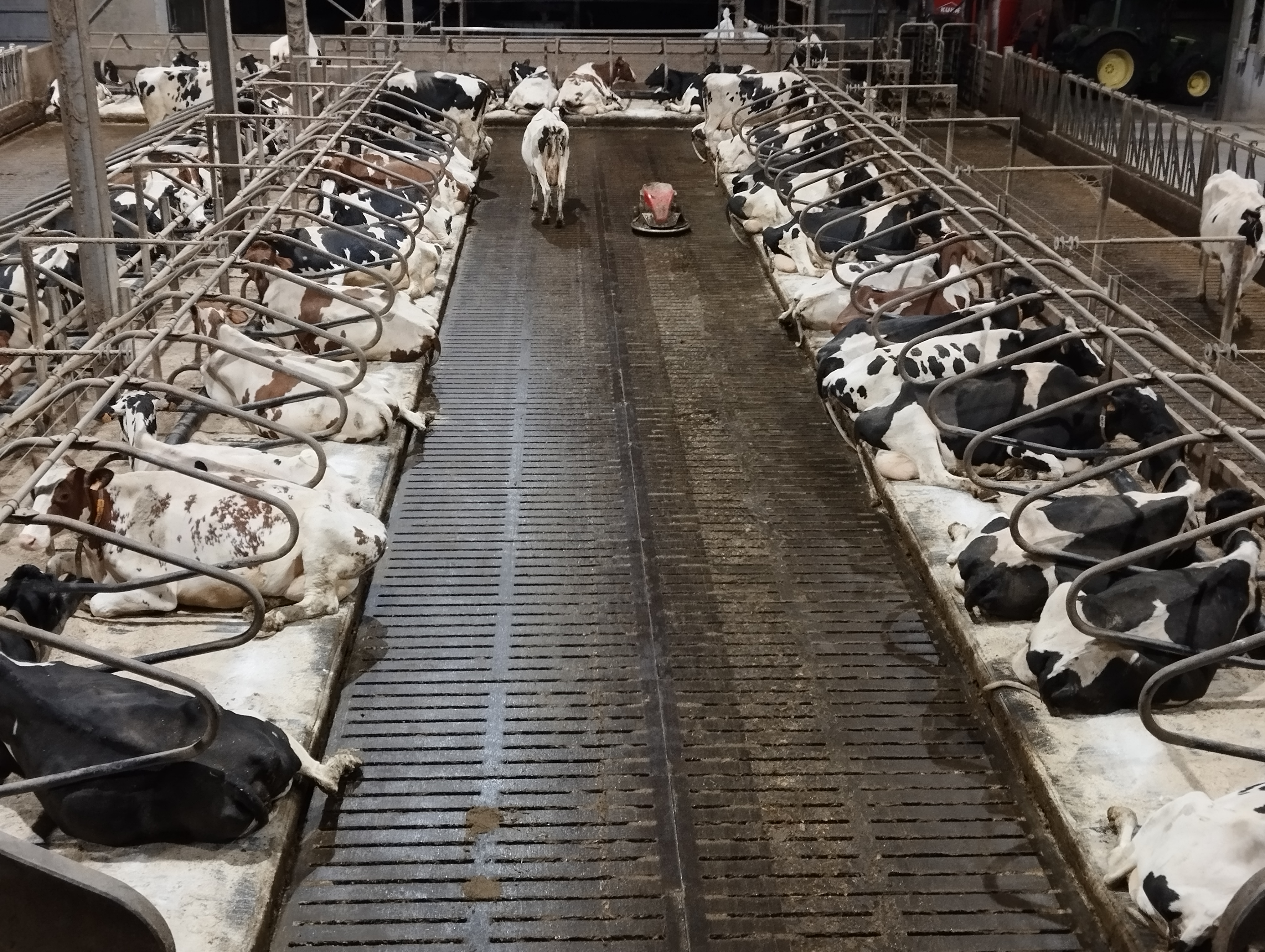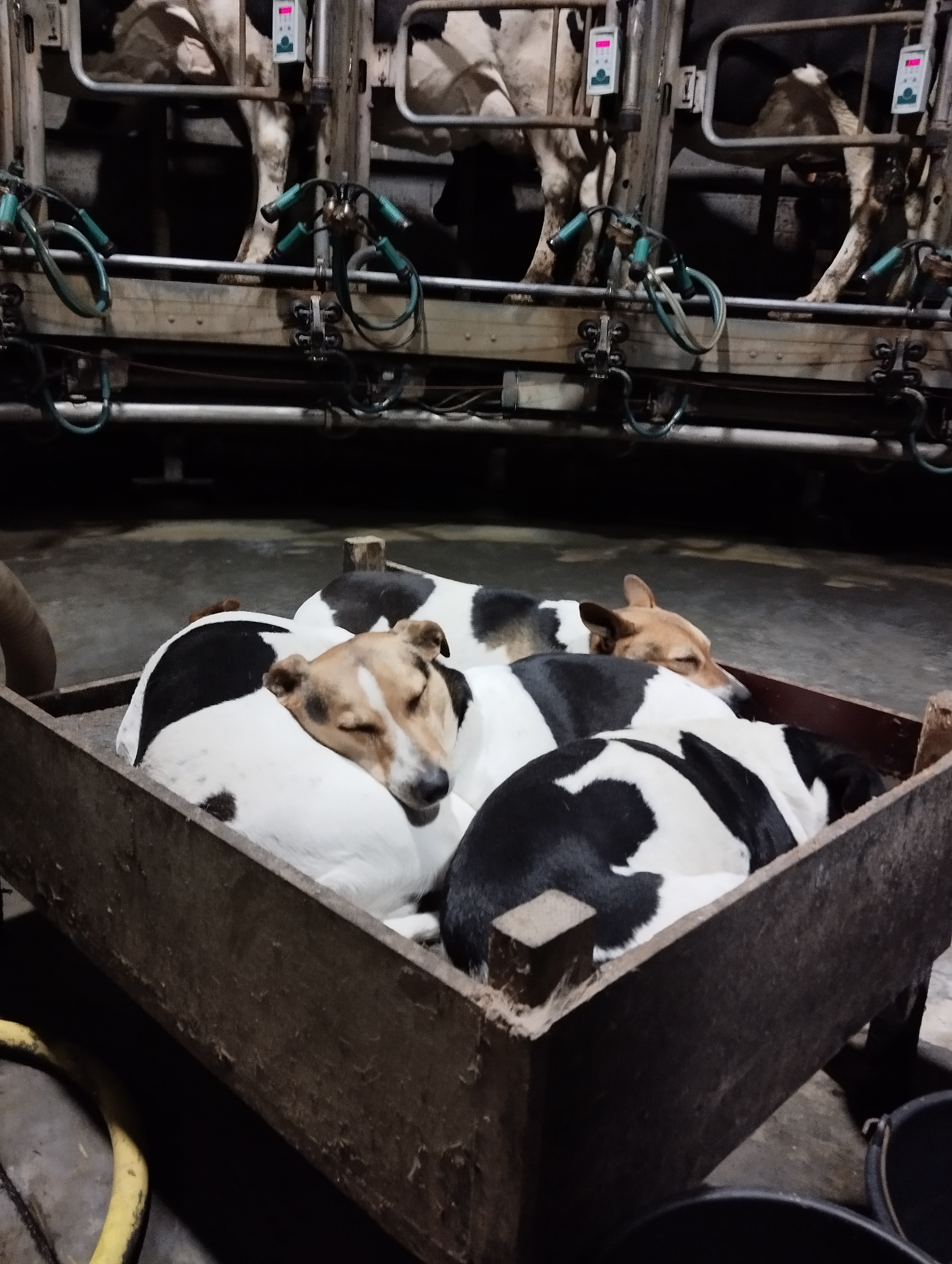 Na een koffiepauze met een koekje beginnen we een goed half uur vroeger dan gewoonlijk aan het werk. Veel vroeger doen we niet, want dan moet je ’s ochtends ook vroeger zijn. Onze honden zijn er ook bij tijdens het melken, lekker knus in hun bedje. We hebben geluk: alles verloopt vlot, geen koeien gekalfd en geen om te insemineren. Een groot verschil met 7 jaar geleden, toen we een extreem drukke periode van kalvingen hadden rond kerst en nieuw. We geven nu nog de kalveren melk en zorgen dat iedereen aan z’n voeder kan door het eens bij te schuiven of in de bakken te scheppen.