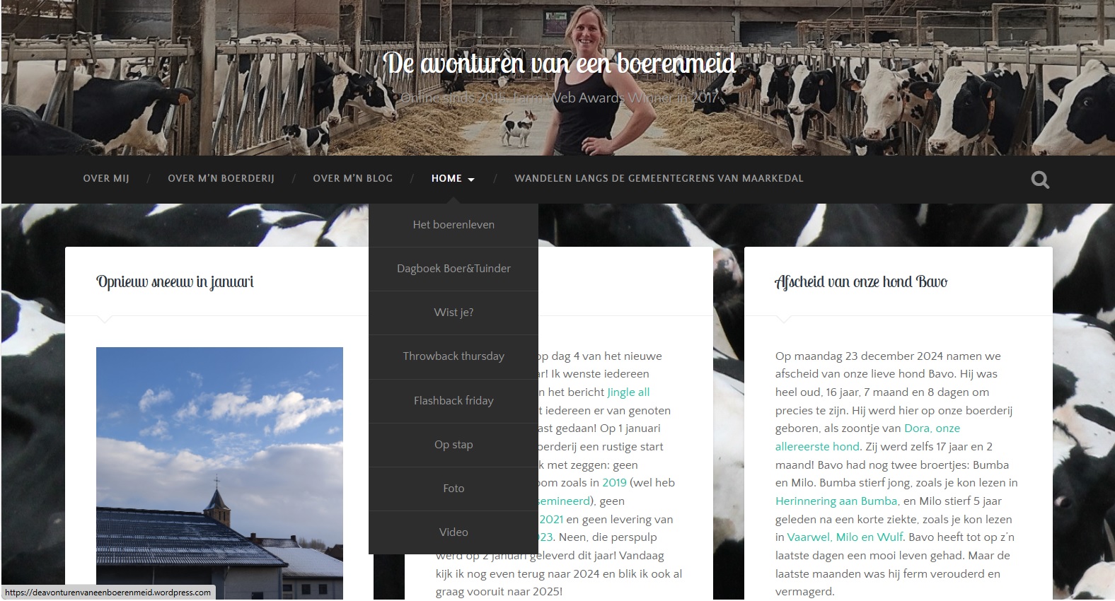 Omdat ik zo veel hou van het boerenleven, van mooie plaatsen, van fotografie en van schrijven kwam ik in januari 2015 op het idee om een blog te creëren. Met een blog kan ik die liefdes van me allemaal combineren, onder de passende blognaam “De avonturen van een boerenmeid”. Het zijn allemaal belevenissen van me, veelal op de boerderij, maar ook daarbuiten.